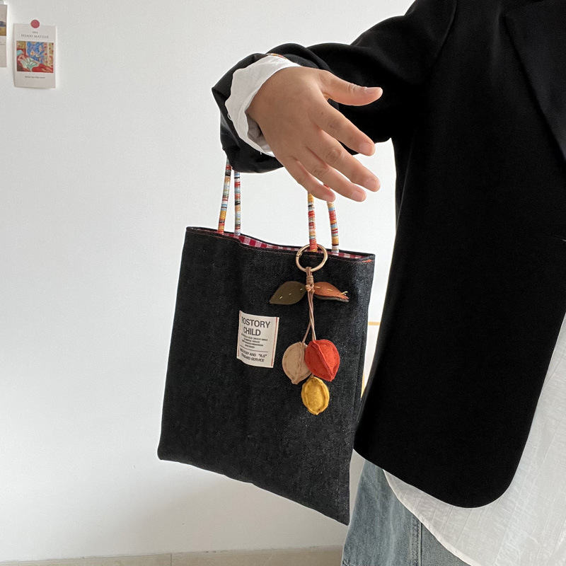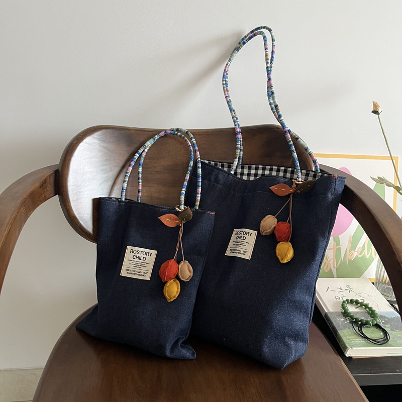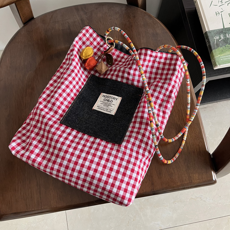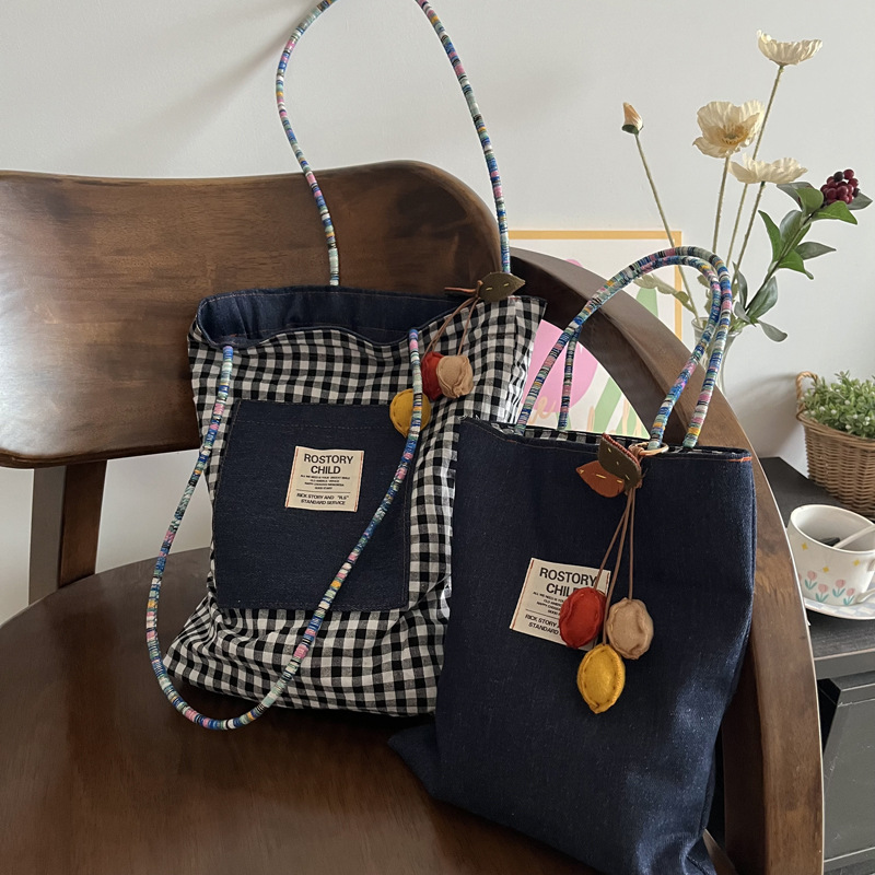 아메리칸 스타일 더블 빵 격자 무늬 데님 캔버스 가방 모든 경기 통근 토트 백 양면 사용 가능한 빈티지 콘트라스트 핸드 백