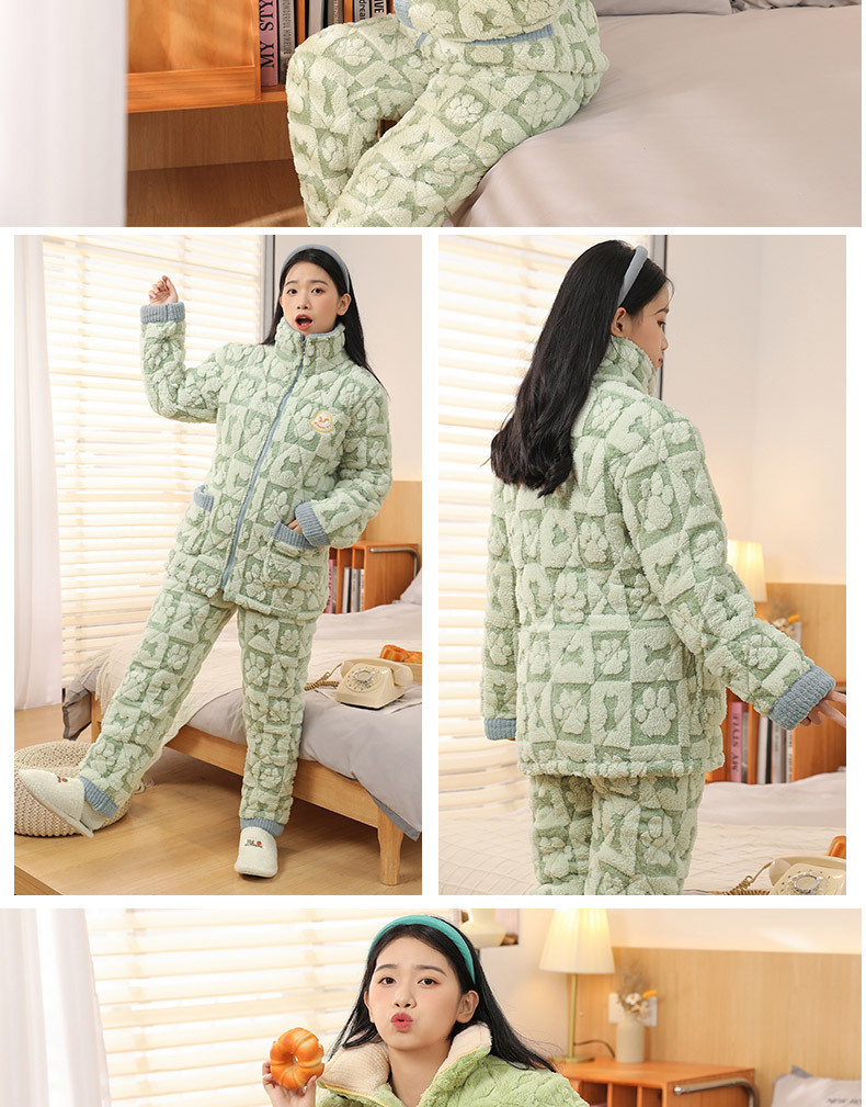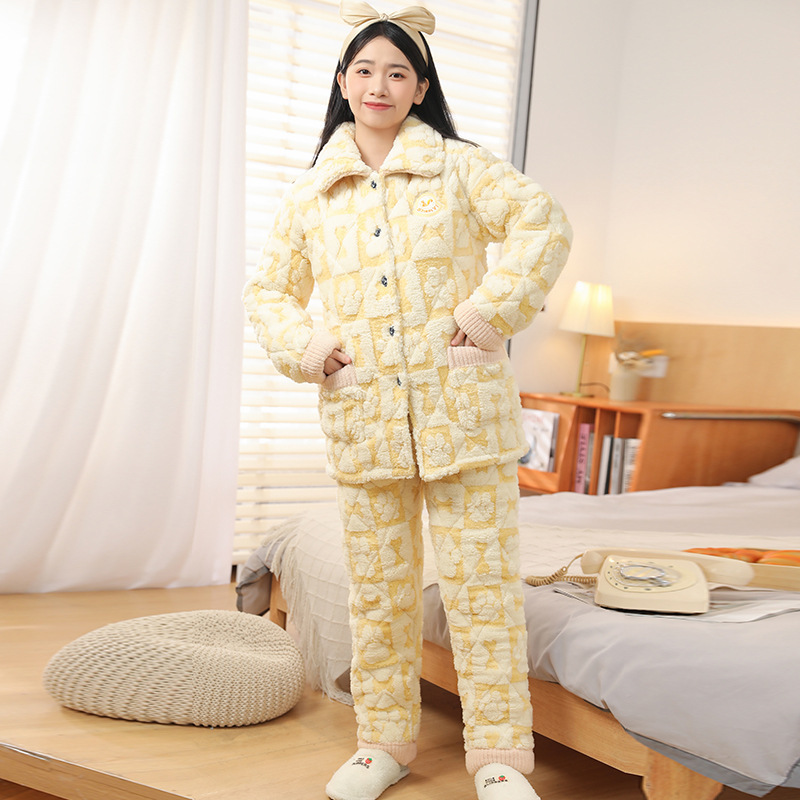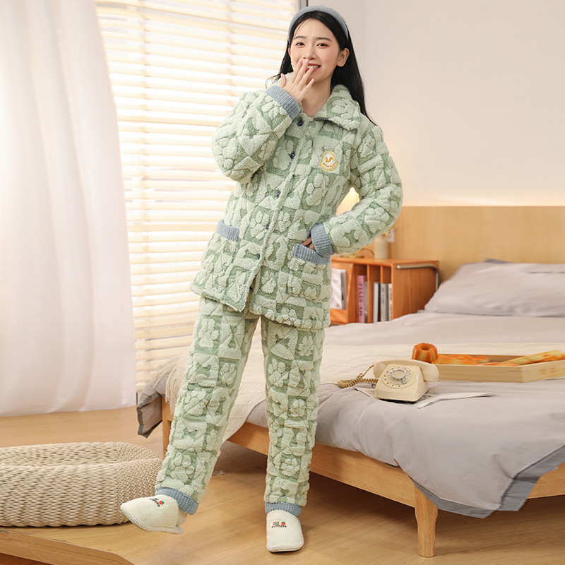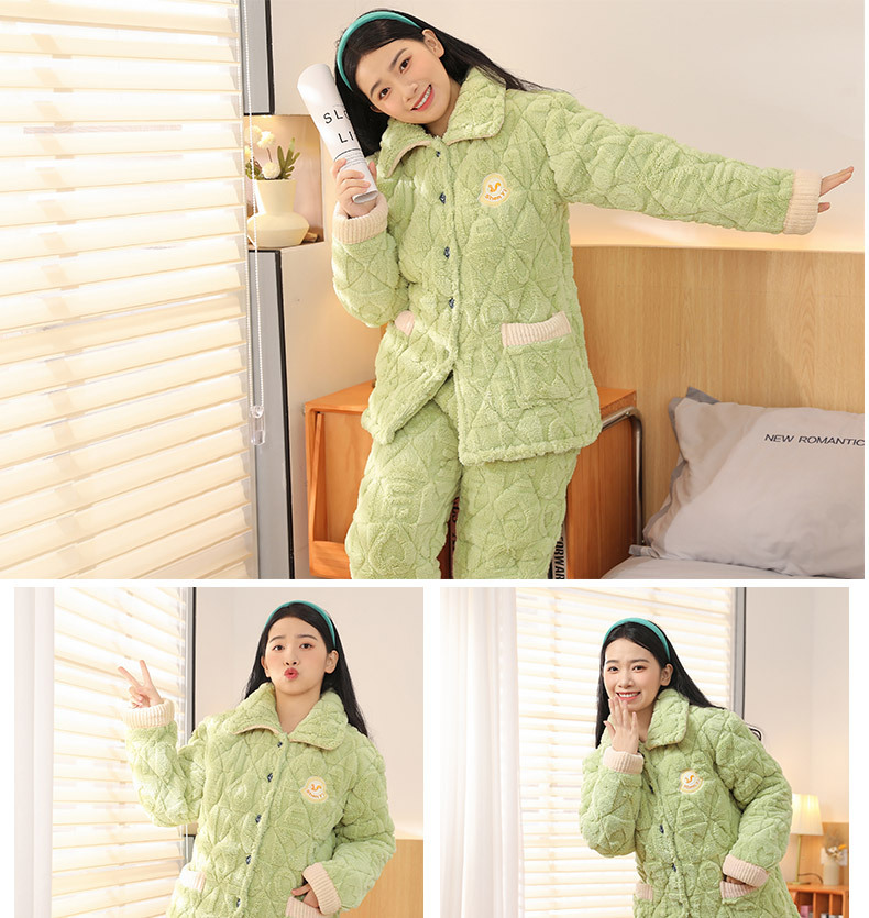 여성 성인 파자마 3 층 두꺼운 퀼트 파자마 여성의 기모 산호 양털은 따뜻한 집 옷을 입을 수 세트
