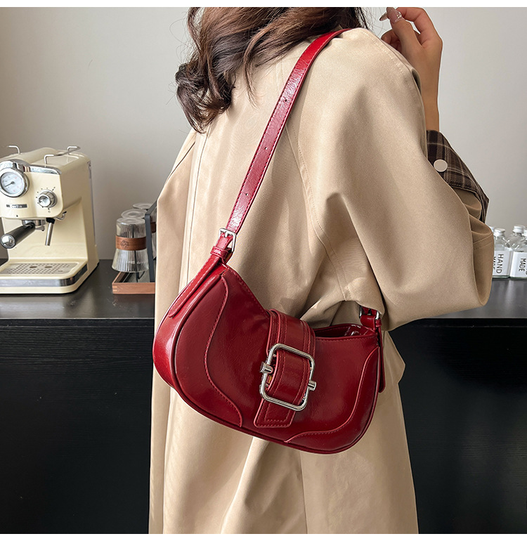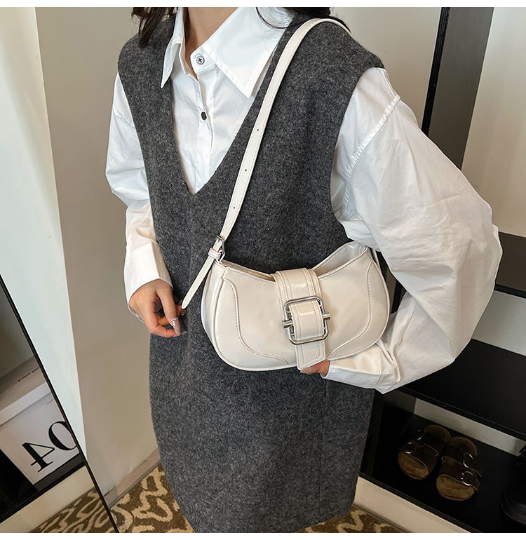 틈새 질감 빈티지 핫 소녀 오토바이 가방 바게트 가방 2024 새로운 특허 가죽 원 숄더 대각선 겨드랑이 가방