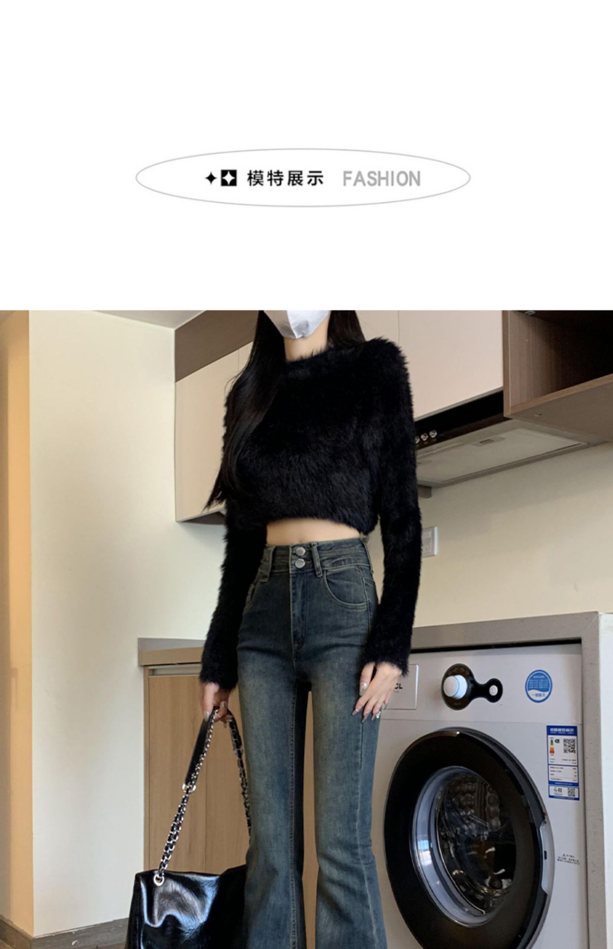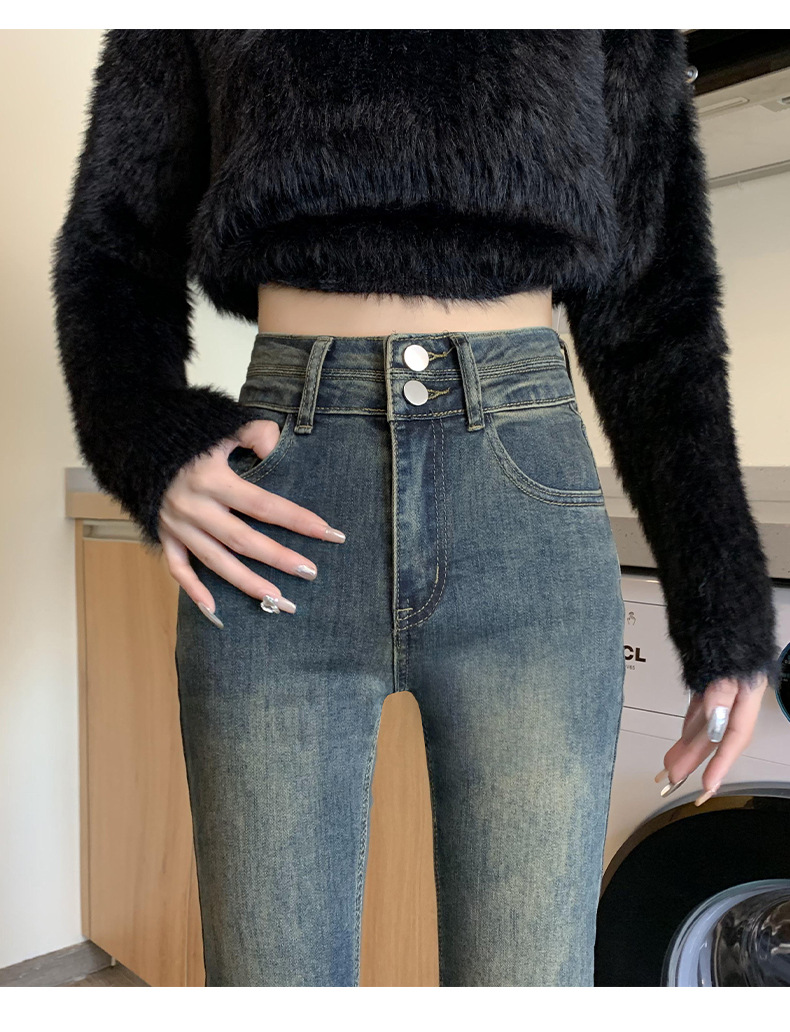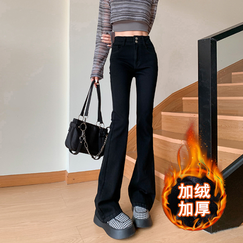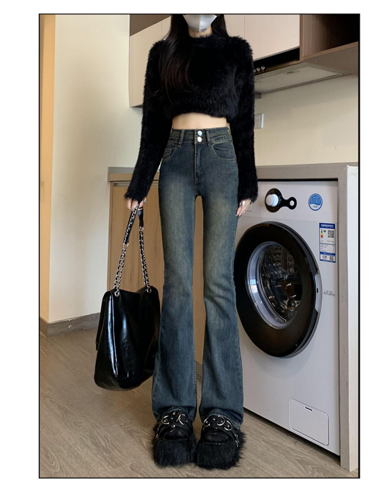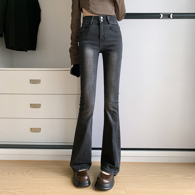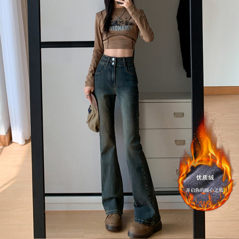 시멘트 그레이 레트로 마이크로 플레어 청바지 여성의 가을과 겨울 2024 새로운 높은 허리 슬리밍 기모 말굽 바지스토어 가기