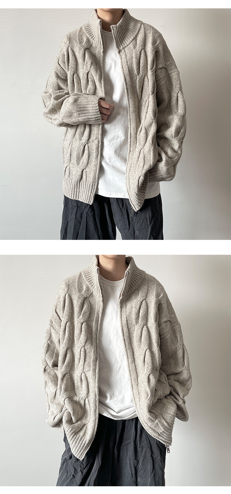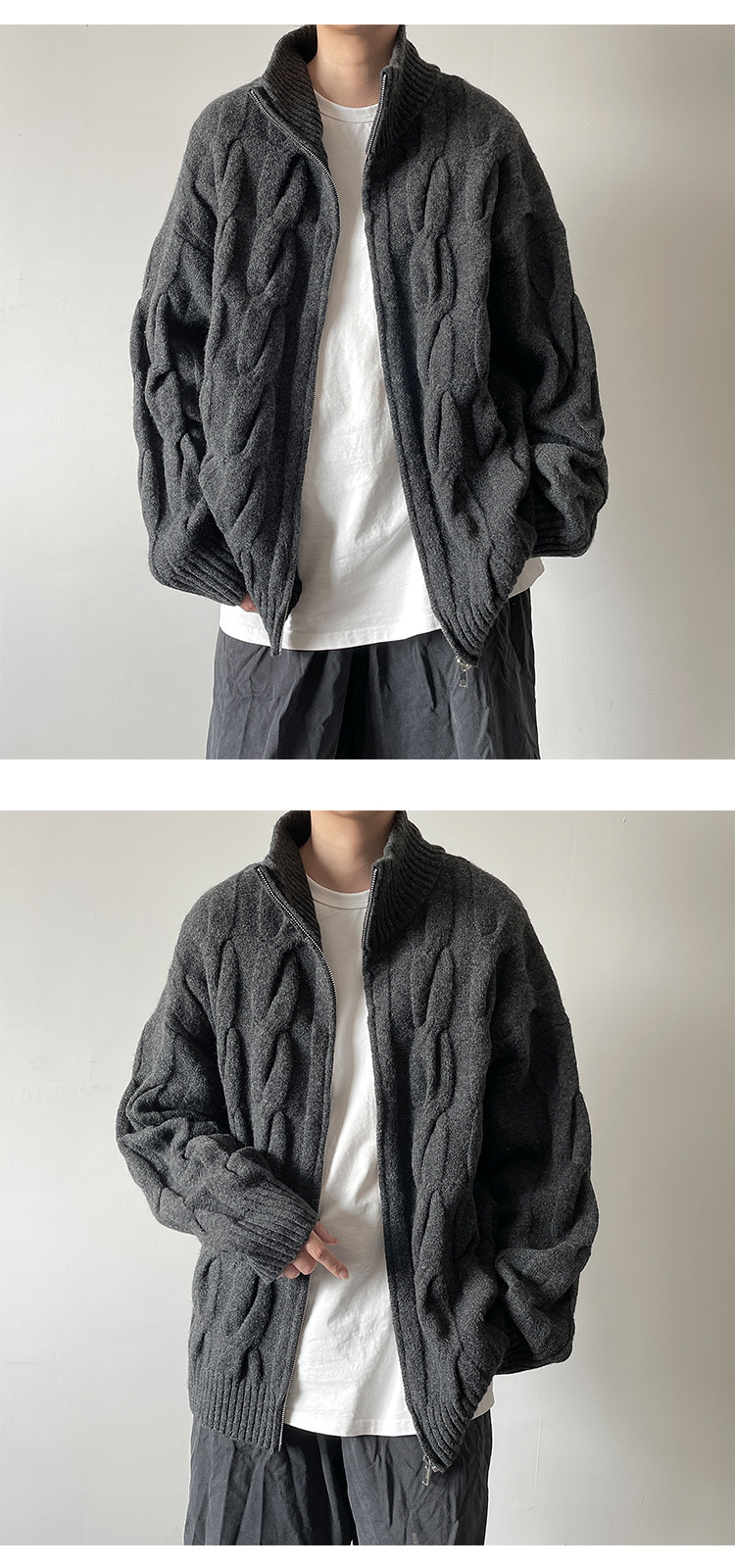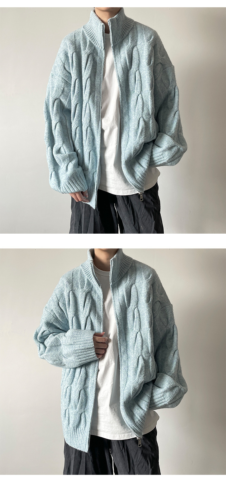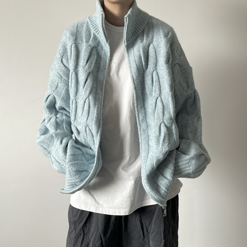 남성과 여성을위한 빈티지 아메리칸 스타일 블루 트위스트 지퍼 카디건 스웨터 느슨한 캐주얼 게으른 니트웨어 재킷