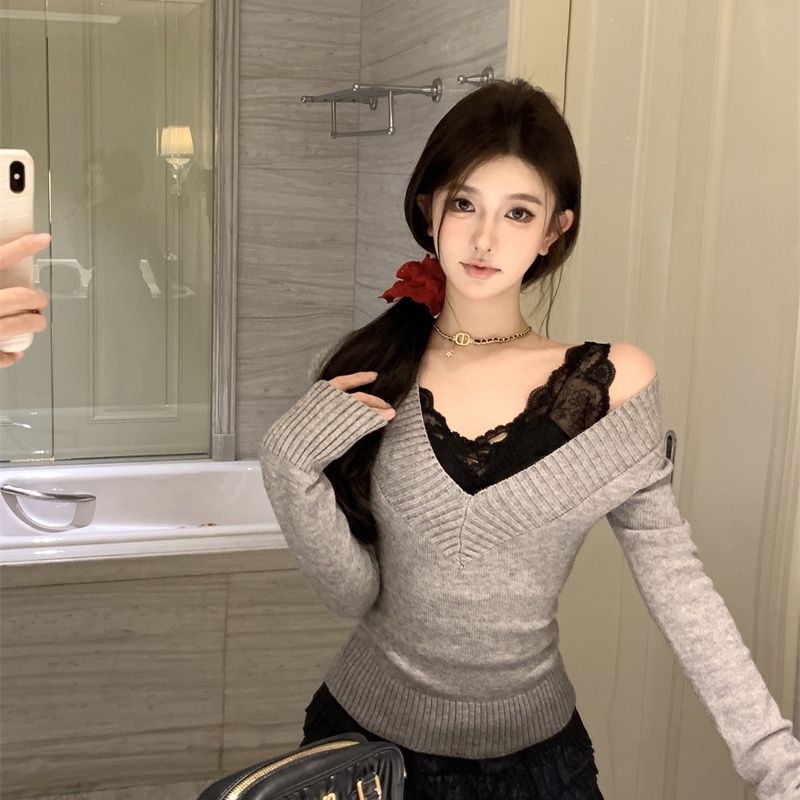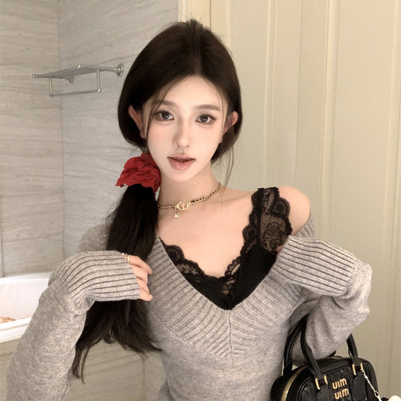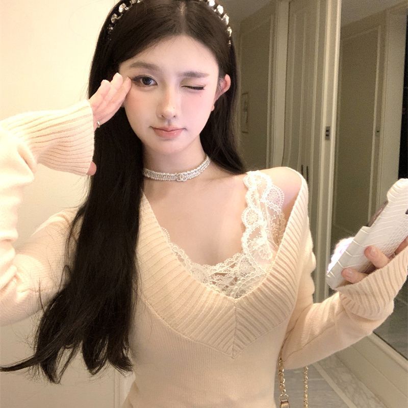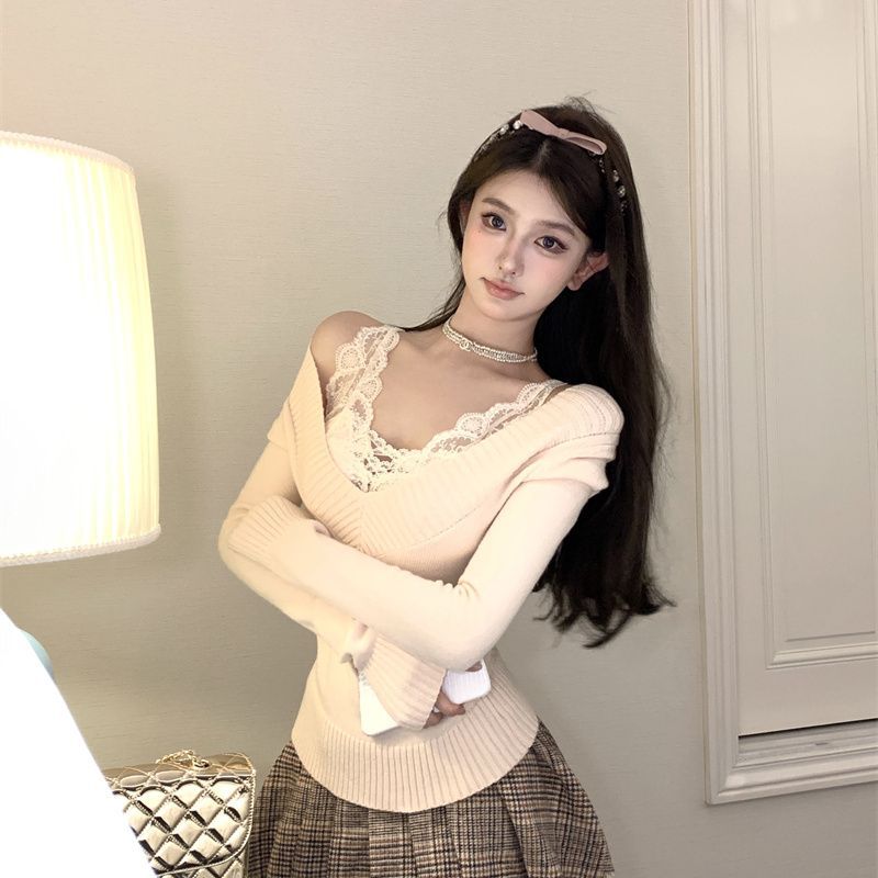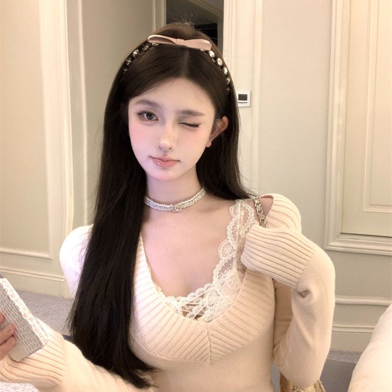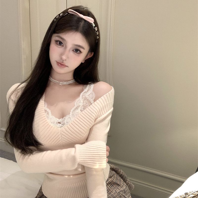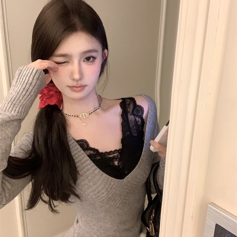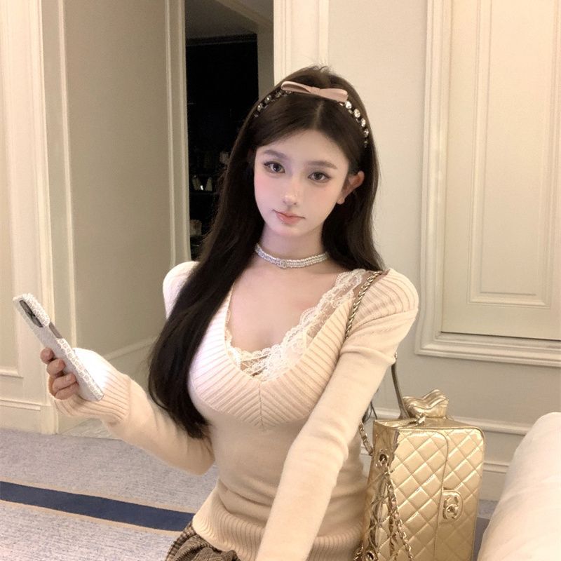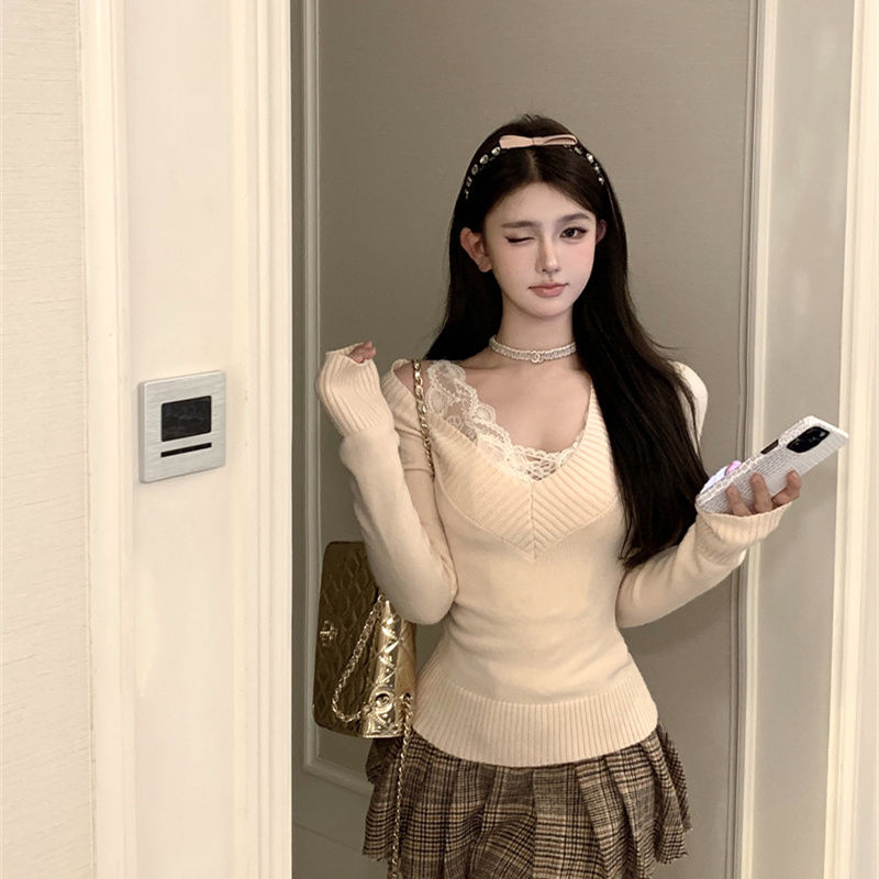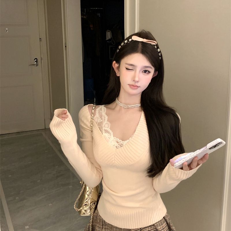 가을과 겨울 새로운 빈티지 슬리밍 달콤하고 매운 니트 스웨터 디자인 세련된 올 매치 V 넥 우아한 내베이스 탑