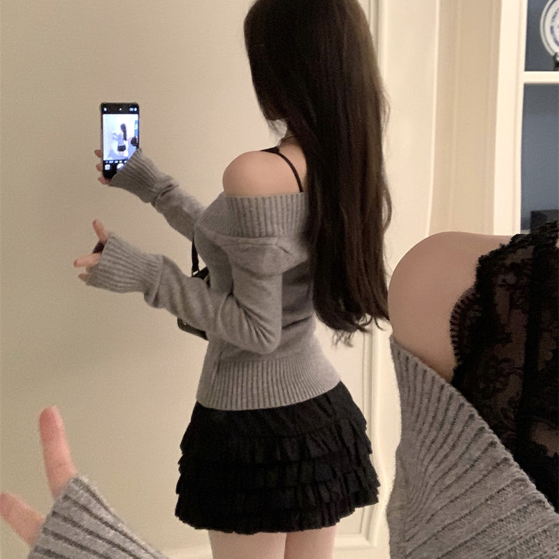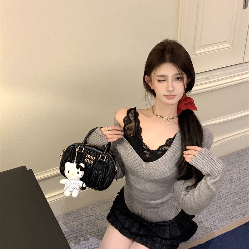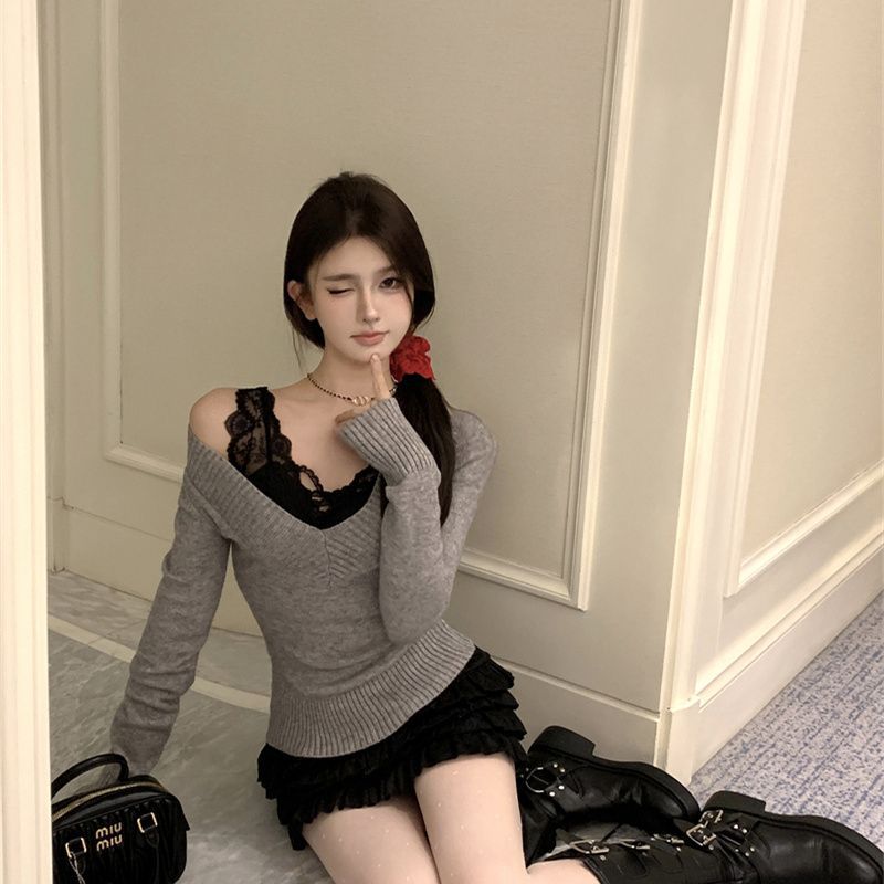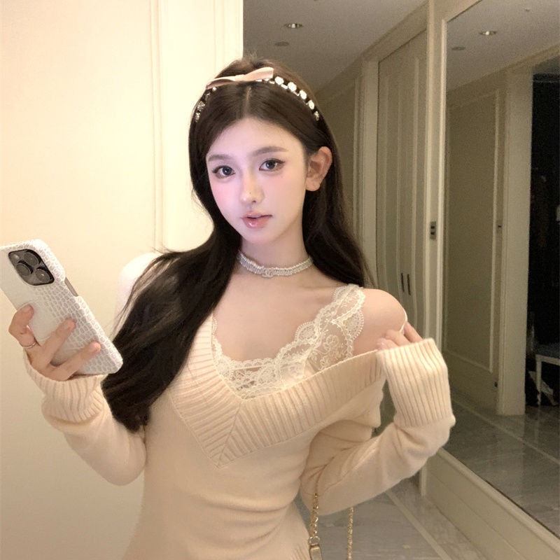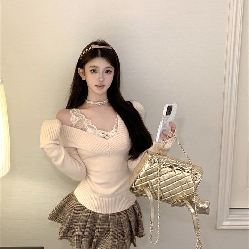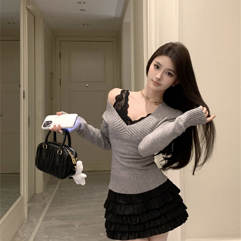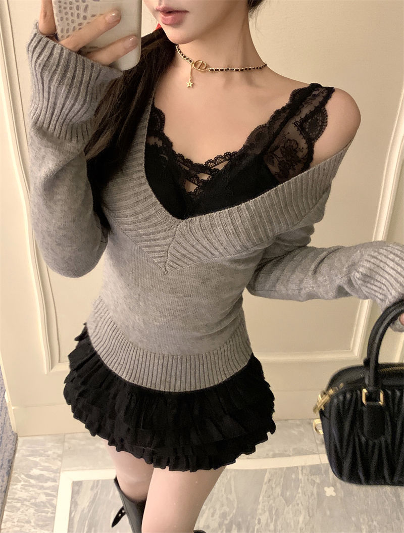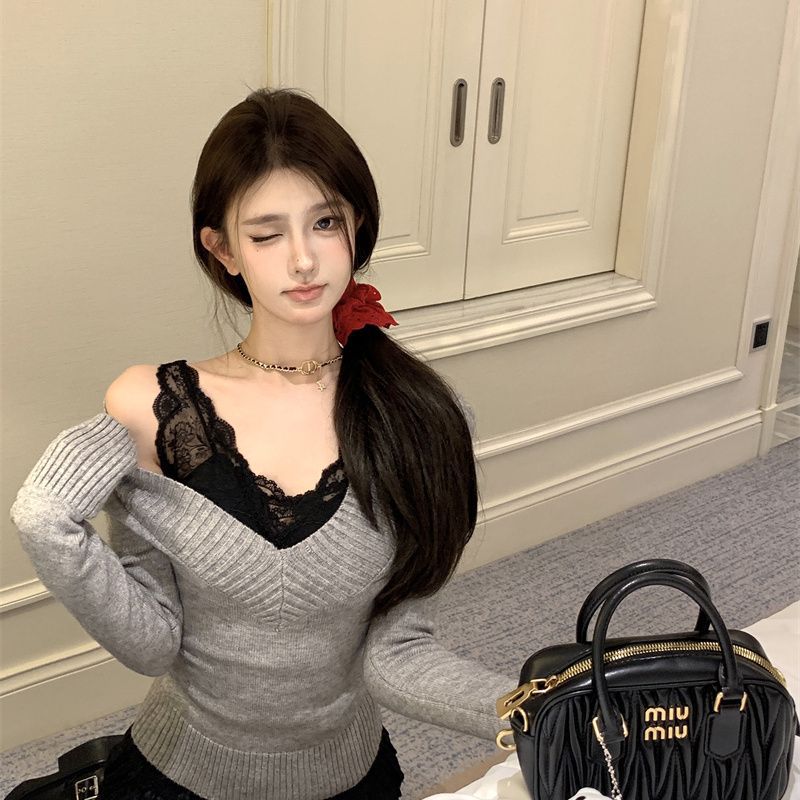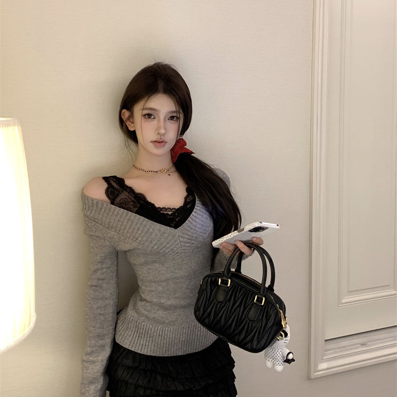 가을과 겨울 새로운 빈티지 슬리밍 달콤하고 매운 니트 스웨터 디자인 세련된 올 매치 V 넥 우아한 내베이스 탑