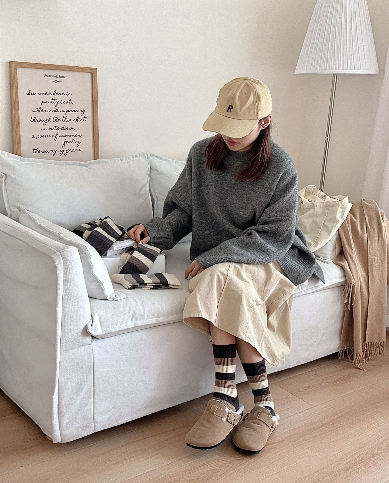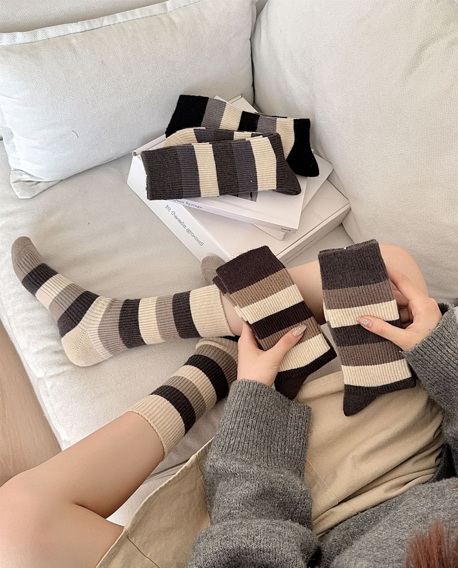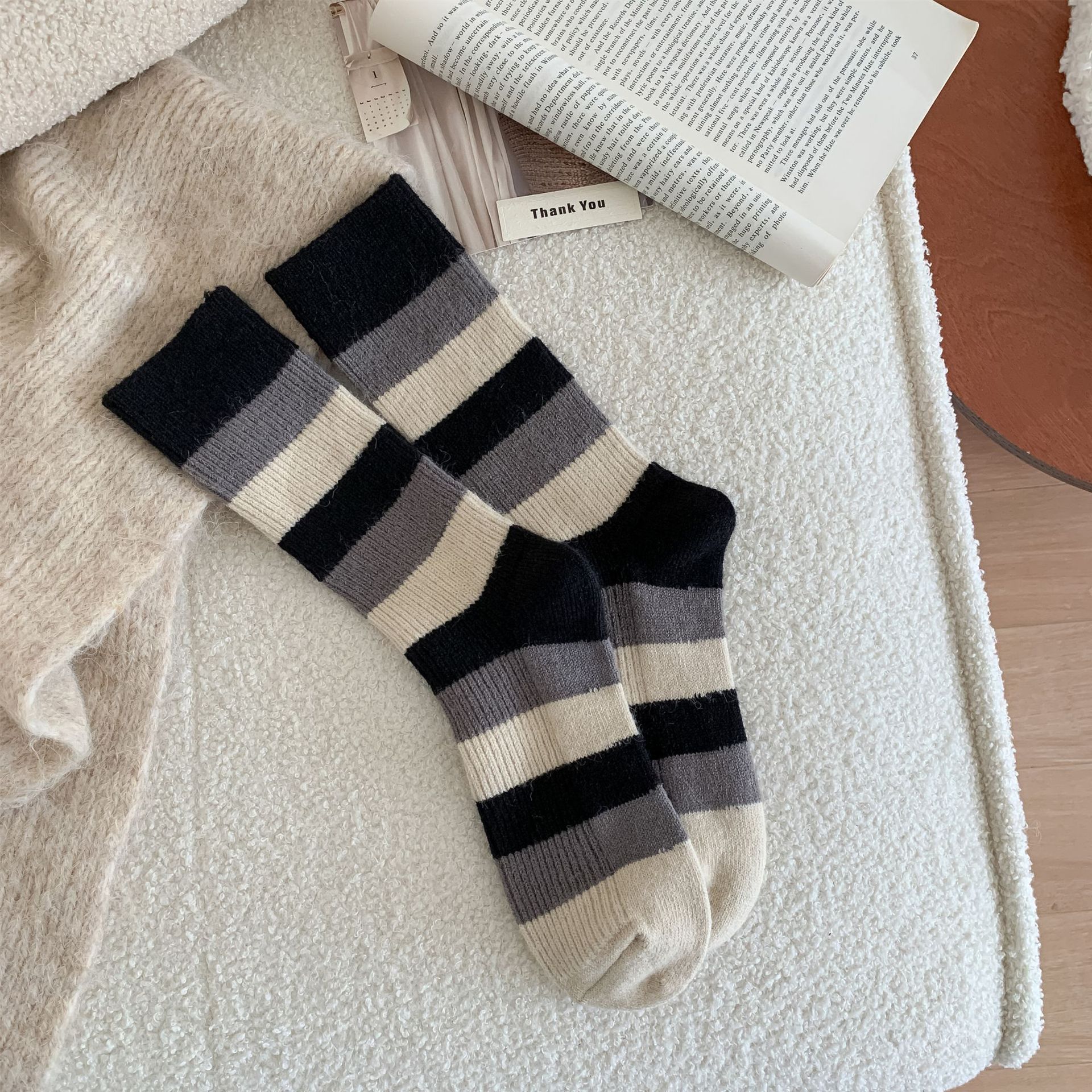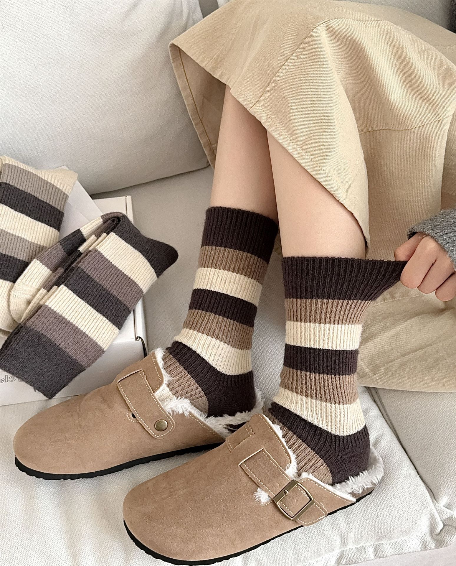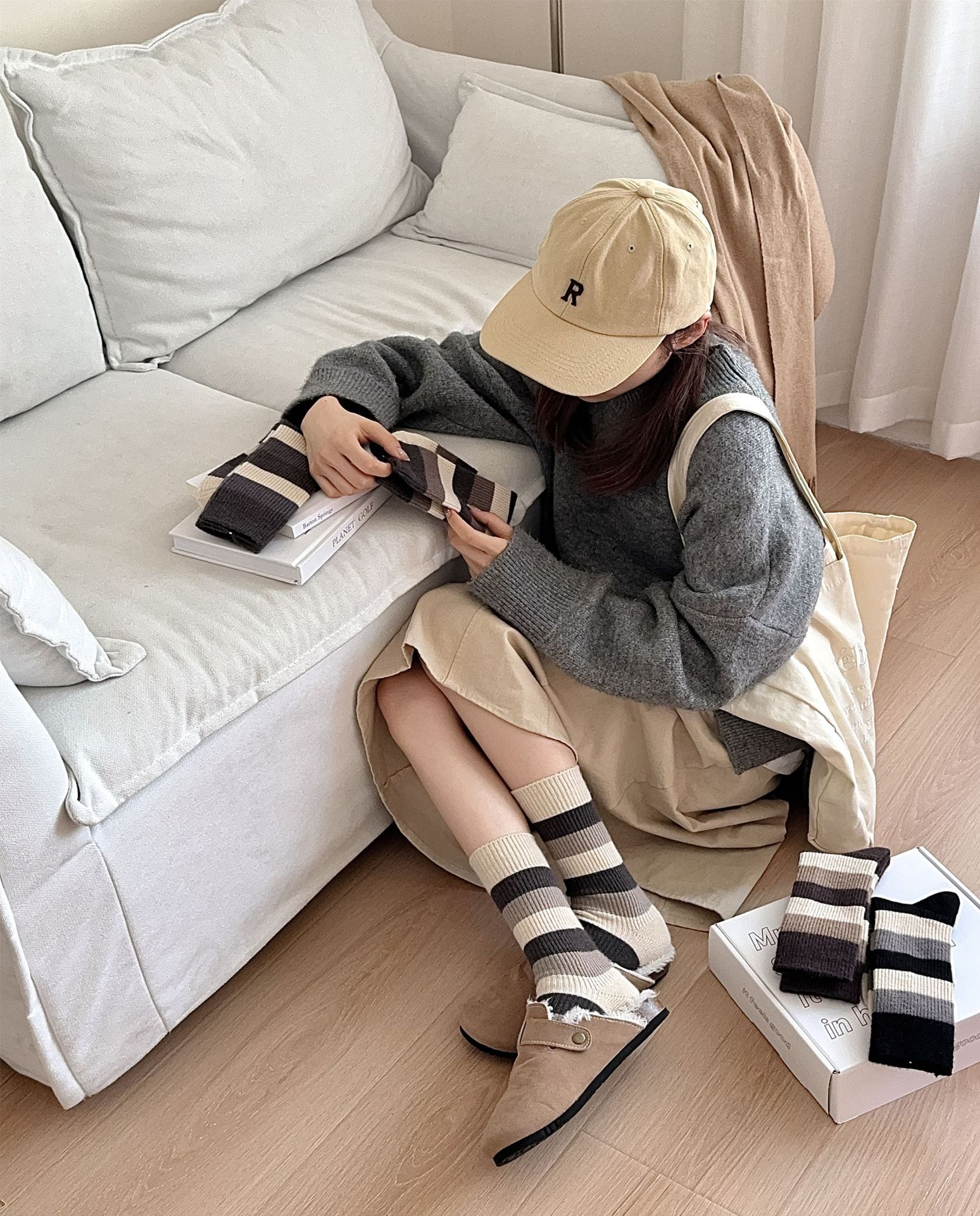 새로운 두꺼운 모조 캐시미어 여성용 양말 따뜻한 · 열 보관 양말 라이트 베이지 동대문 디자인 와이드 스트립 스택 양말스토어 가기