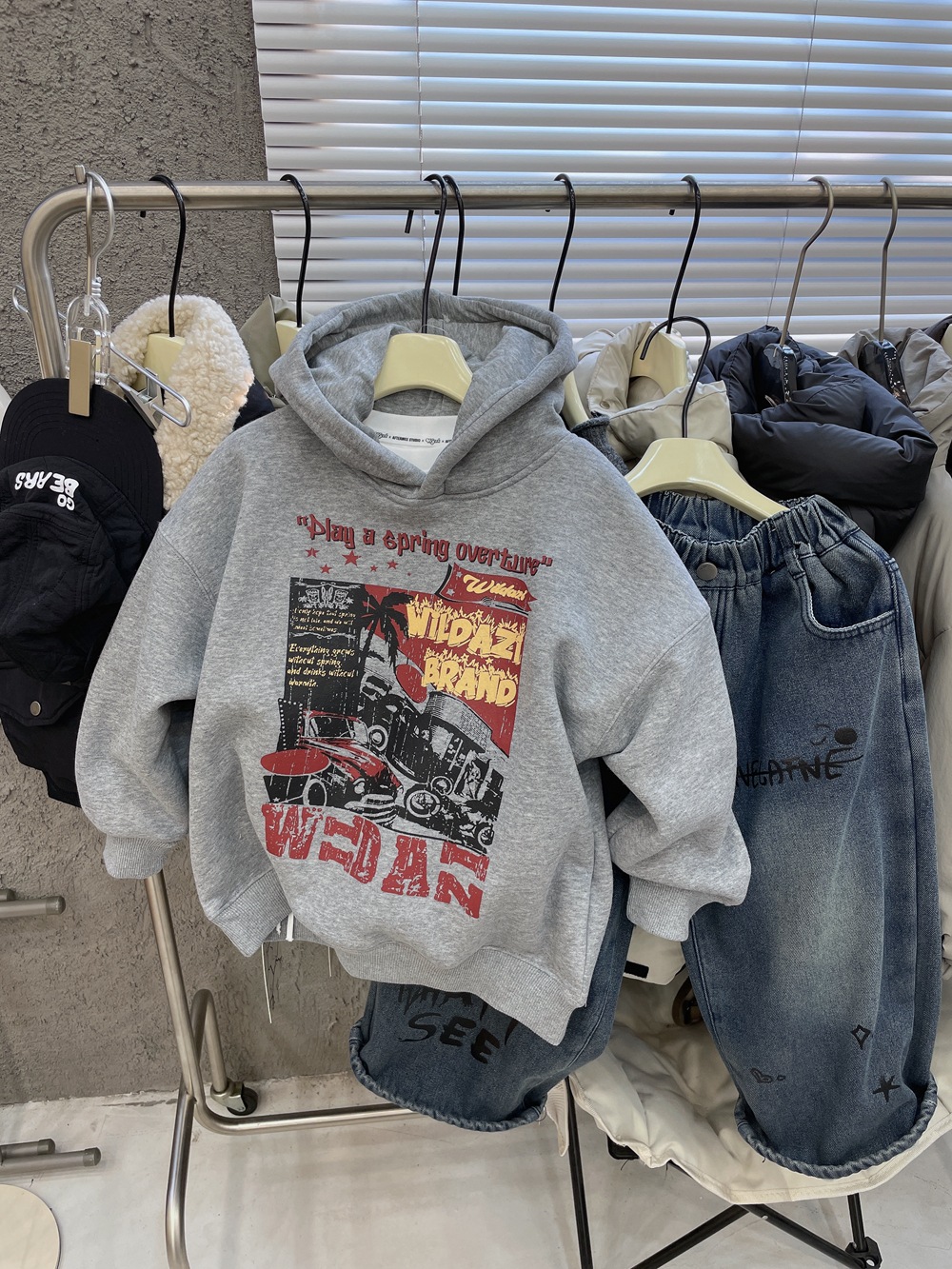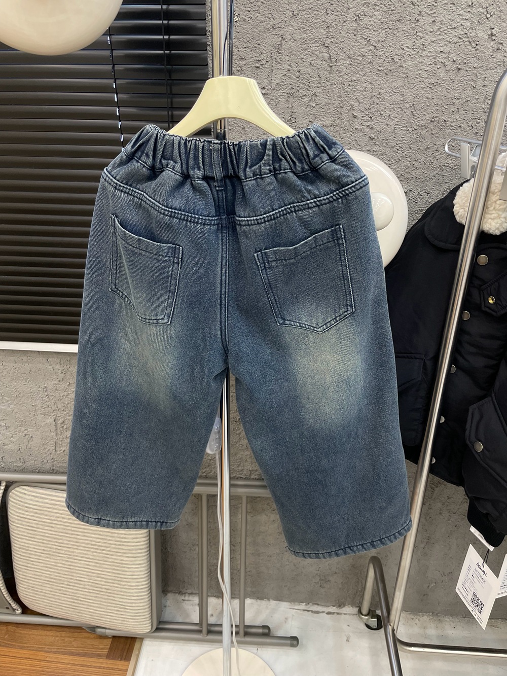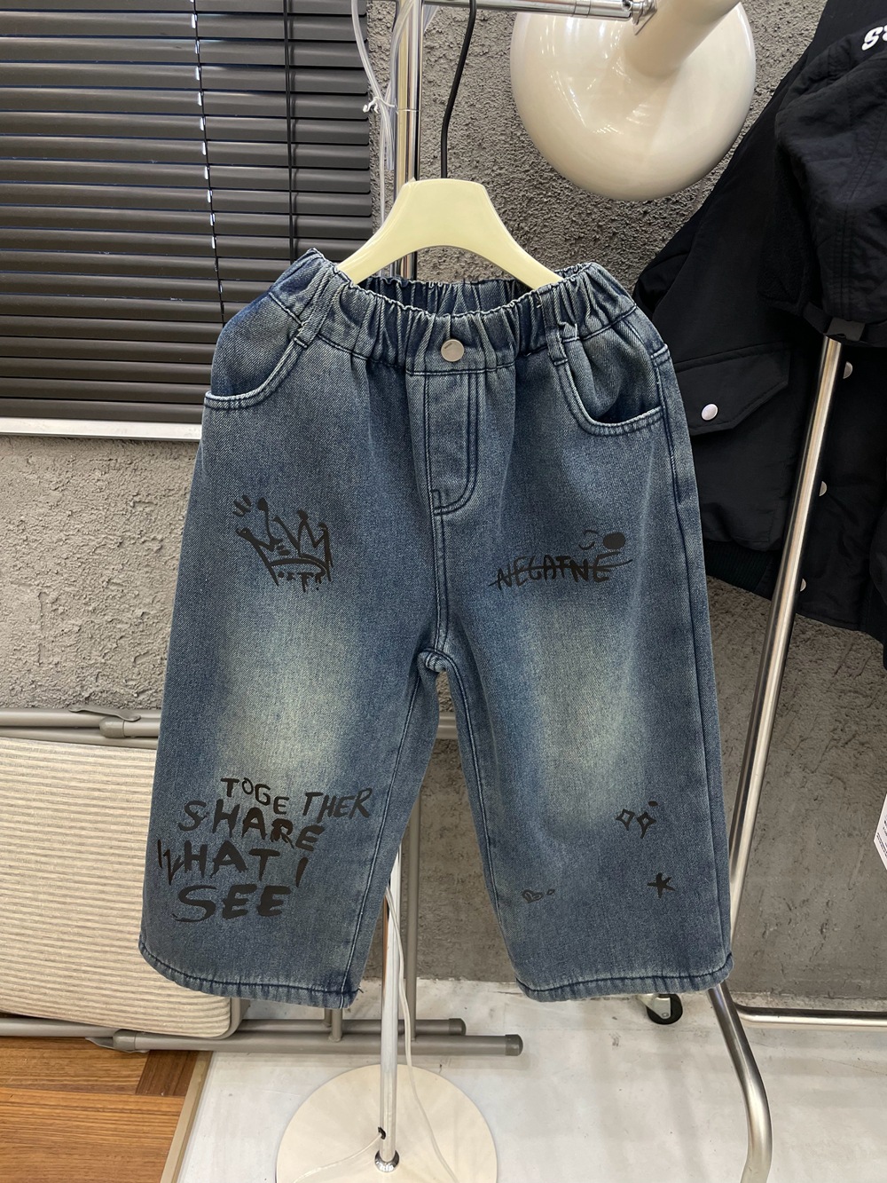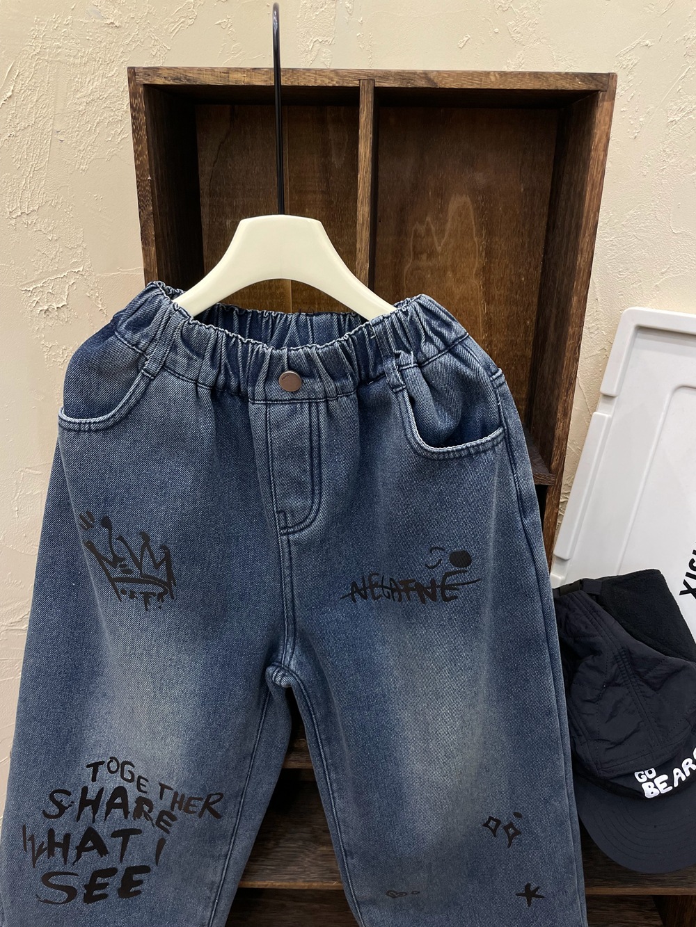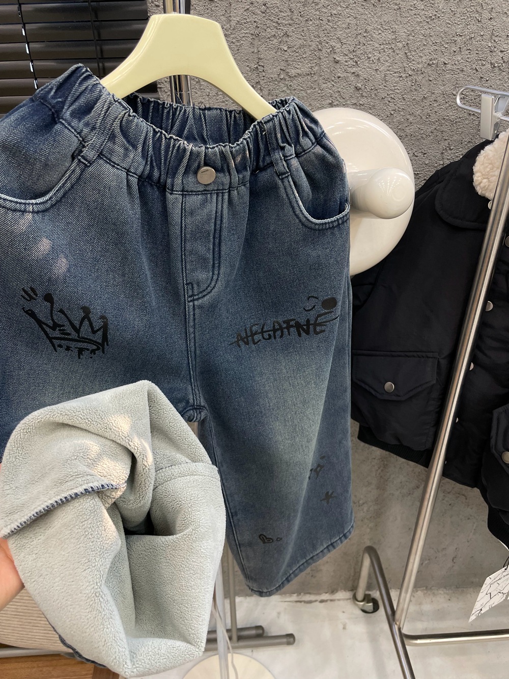 어린이 2024 년 겨울 새 낙서 인쇄 기모 청바지 원피스 벨벳 루즈 스트레이트 바지 소년 트렌디 한 바지스토어 가기
