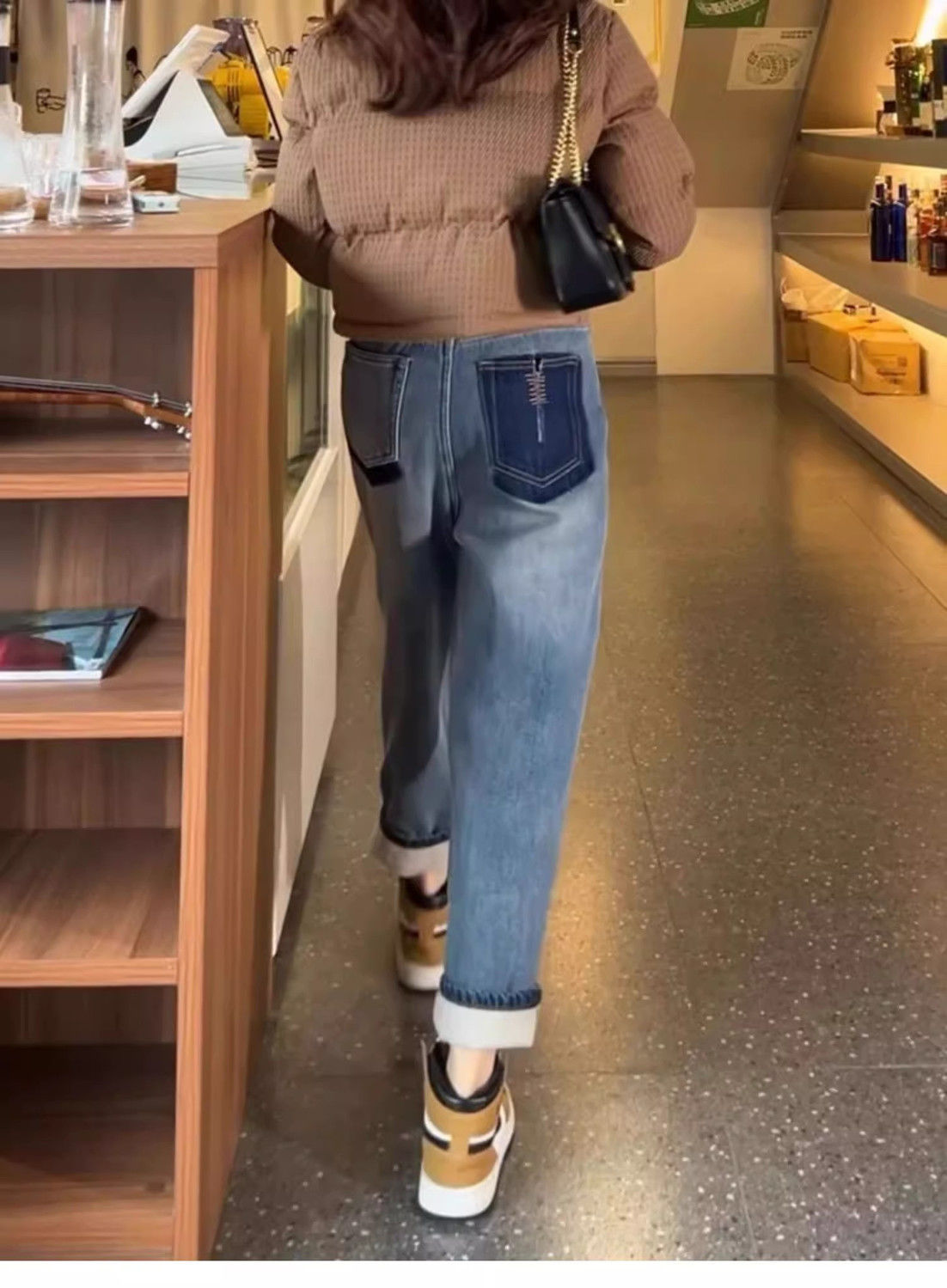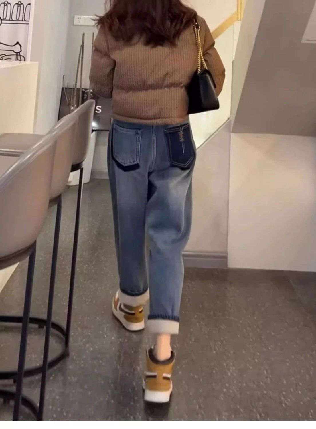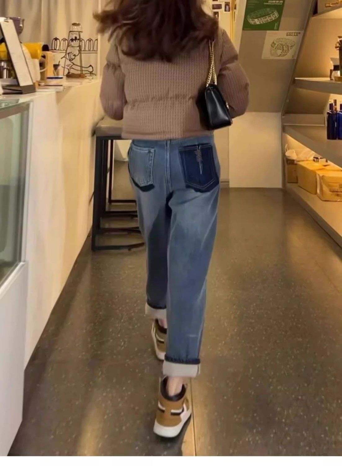 빅사이즈 배색 하이웨이스트 기모 두꺼운 하렘 청바지 여성용 2025 겨울 신상 루즈핏 슬림핏 아빠바지스토어 가기