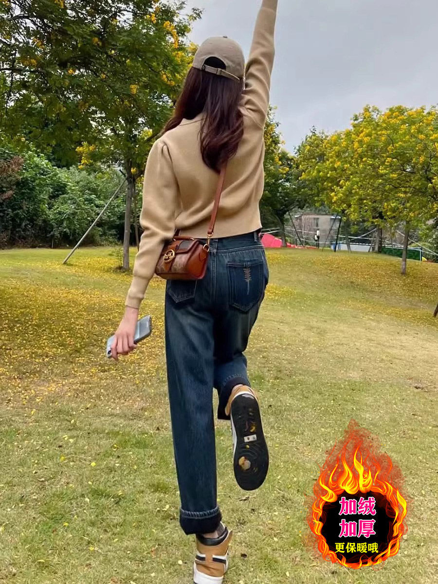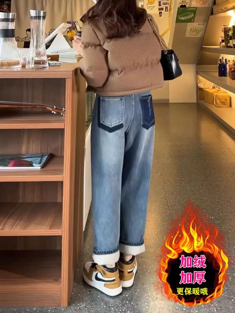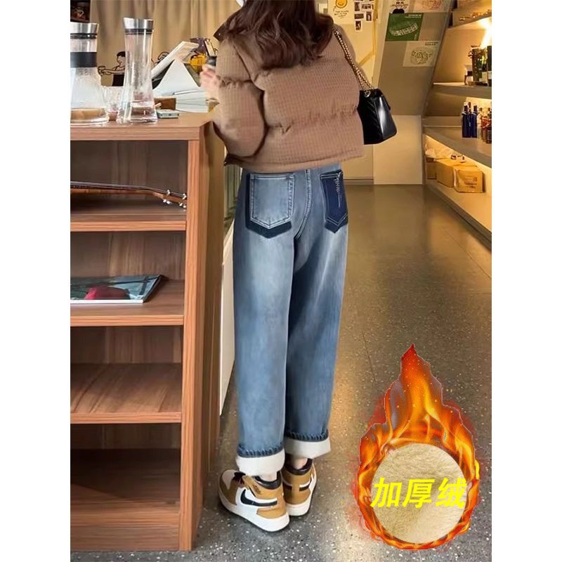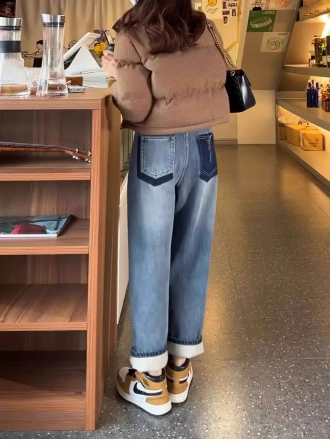 빅사이즈 배색 하이웨이스트 기모 두꺼운 하렘 청바지 여성용 2025 겨울 신상 루즈핏 슬림핏 아빠바지스토어 가기