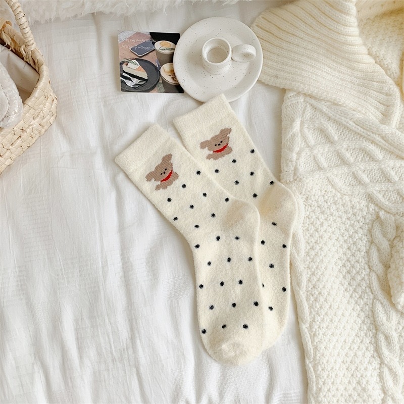 양말 여성의 호주 벨벳 Ins 유행 가을 및 겨울 기모 중간 배럴 줄무늬 만화 자수 강아지 양말 대학 귀여운 바닥 양말