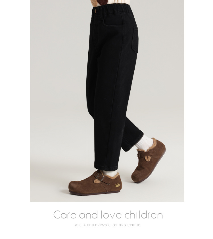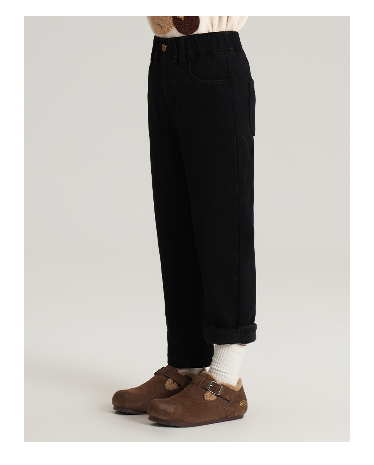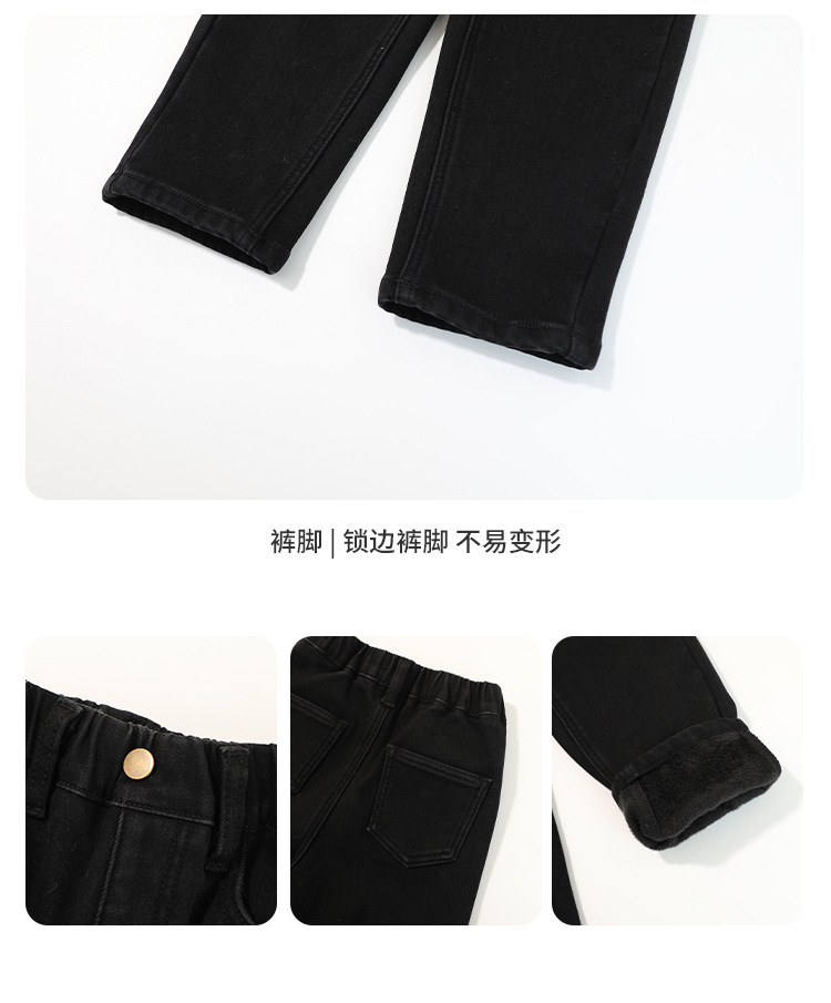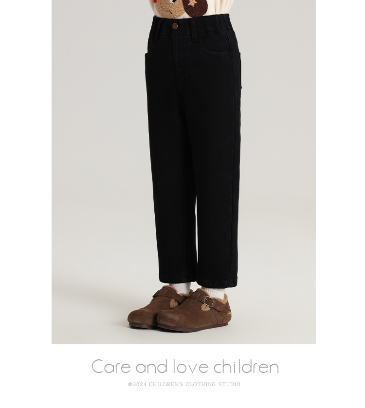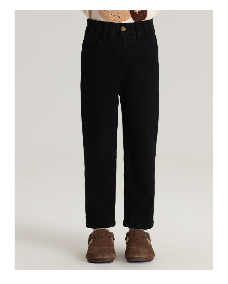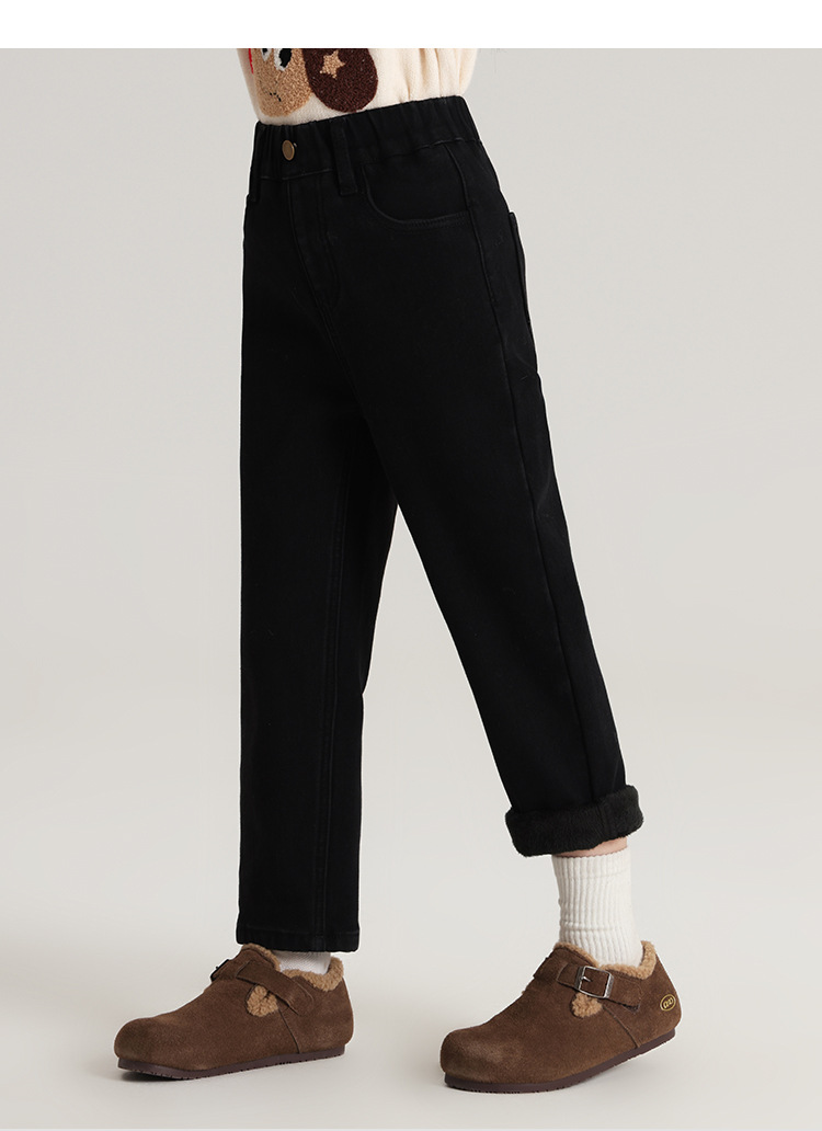 Momo Children's Wear Winter Wear Girl's All match 양털 추가 바지 2024 겨울 새 어린이 검은 스트레치 데님 바지스토어 가기