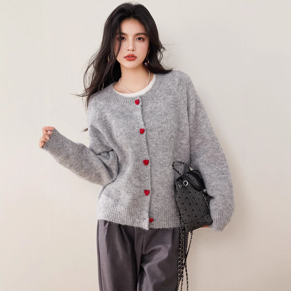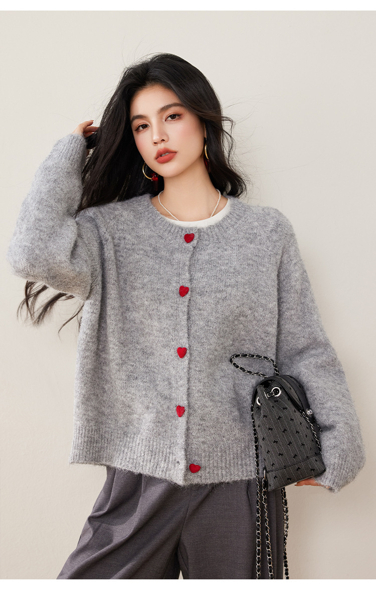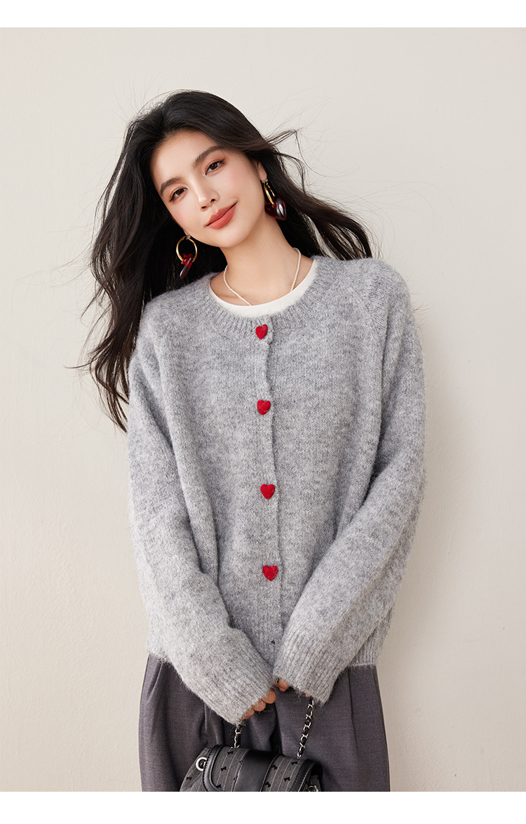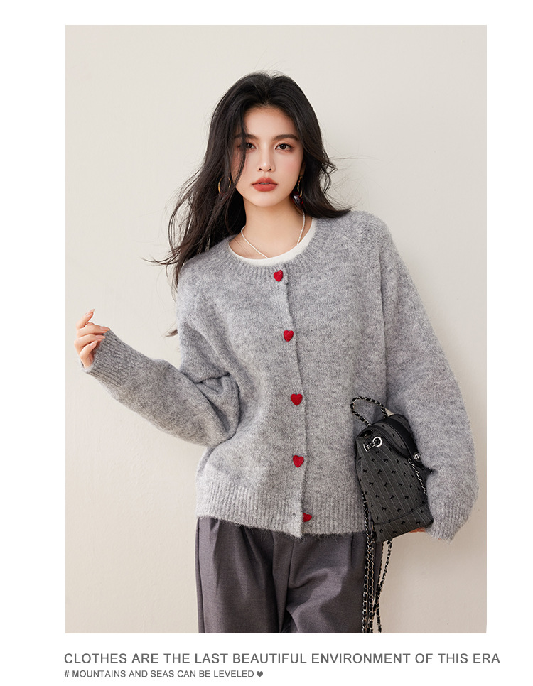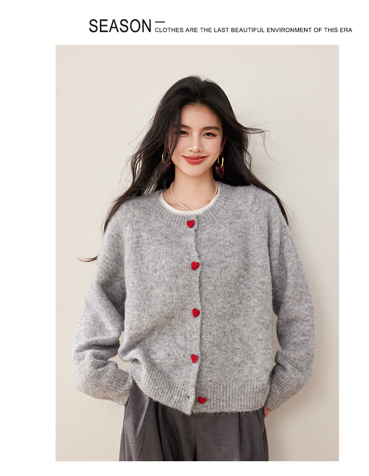 2024 겨울 새로운 한국 스타일 달콤하고 장난스러운 디자인 사랑 버튼 스웨터 카디건 라운드 넥 니트 자켓