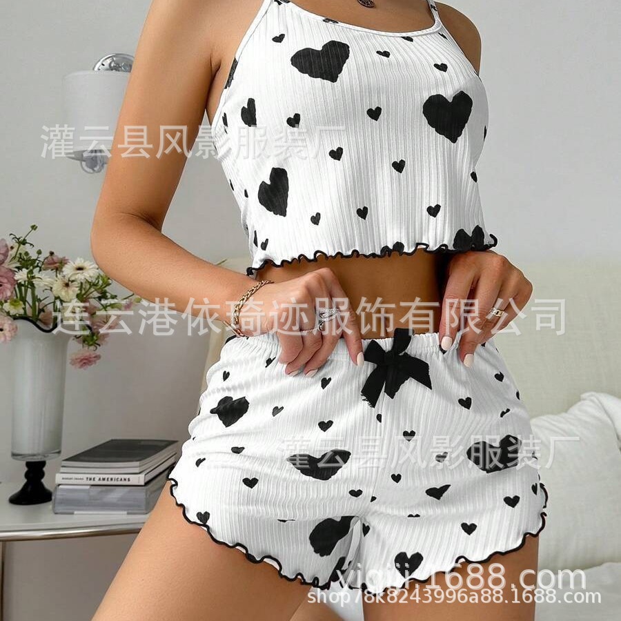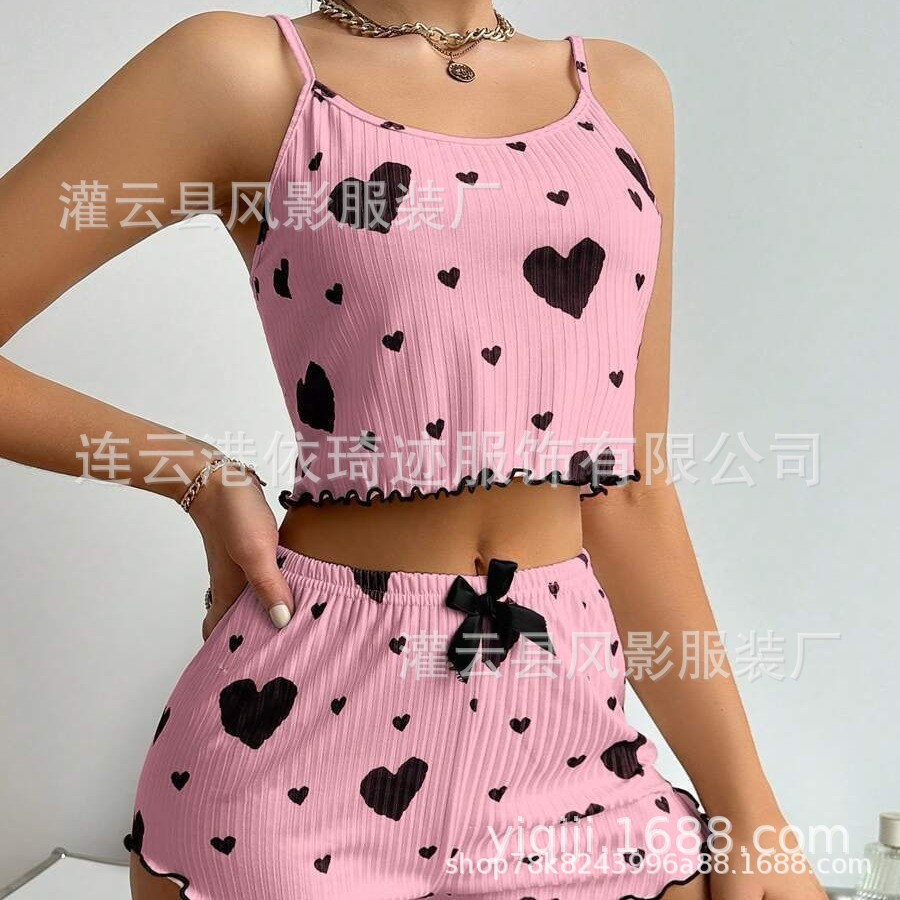 여름 새로운 유럽과 미국의 2024 니트 핏 스트립 사랑 인쇄 디자인 달콤한 슬링 반바지 순수 파자마스토어 가기