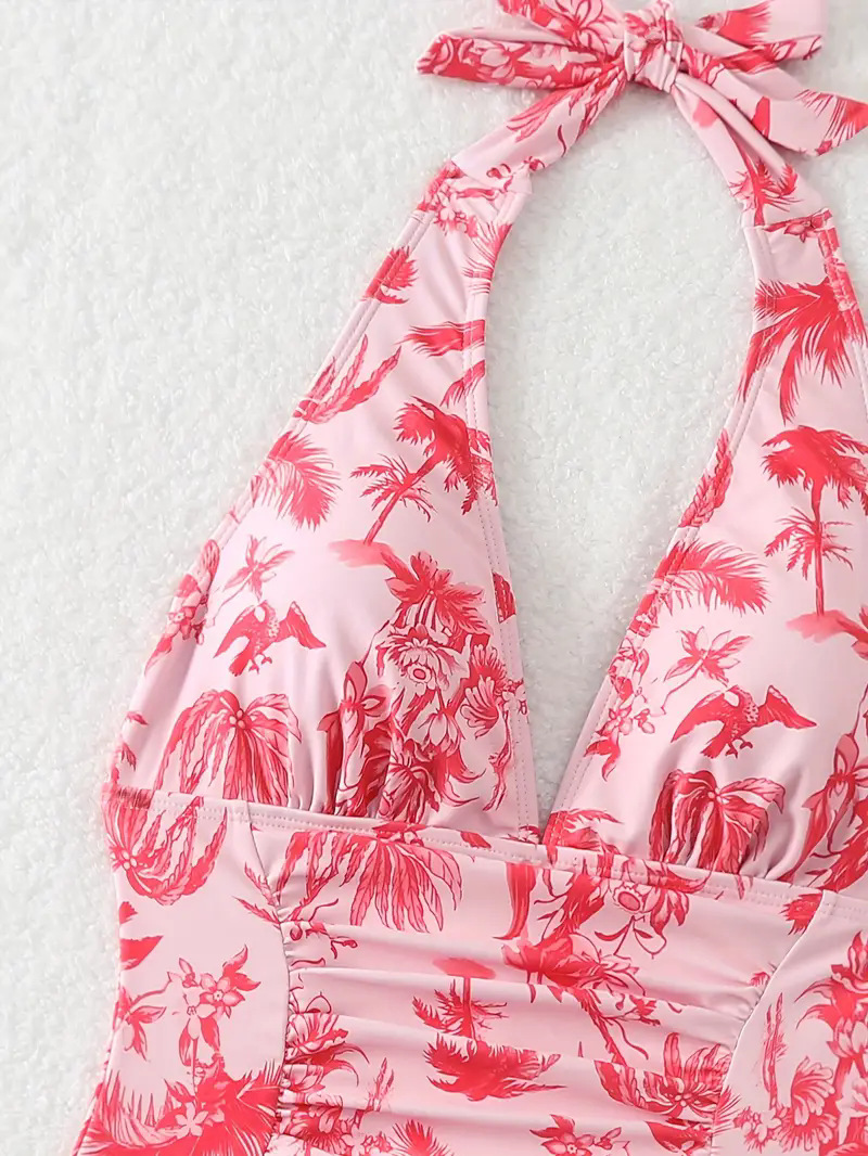 국경 간 대외 무역 원피스 수영복 여성용 코코넛 트리 인쇄 섹시한 V 넥 순수한 욕망 스파이스 소녀 유럽과 미국 스타일 원피스 홀리데이 수영복