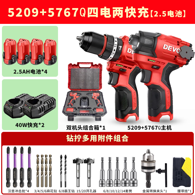 • 드릴과 트위스트 조합 5209+5767Q [배터리 4개, 고속충전 2개 2.5] 럭셔리 액세서리 + 콤비네이션 박스
