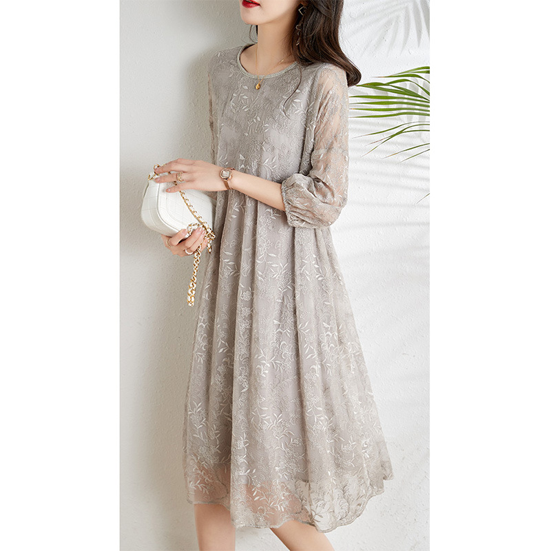 2024 새로운 뽕나무 실크 원피스 여성 봄과 여름 한국 스타일 하이 엔드 그레이 느슨한 무거운 실크 롱 원피스