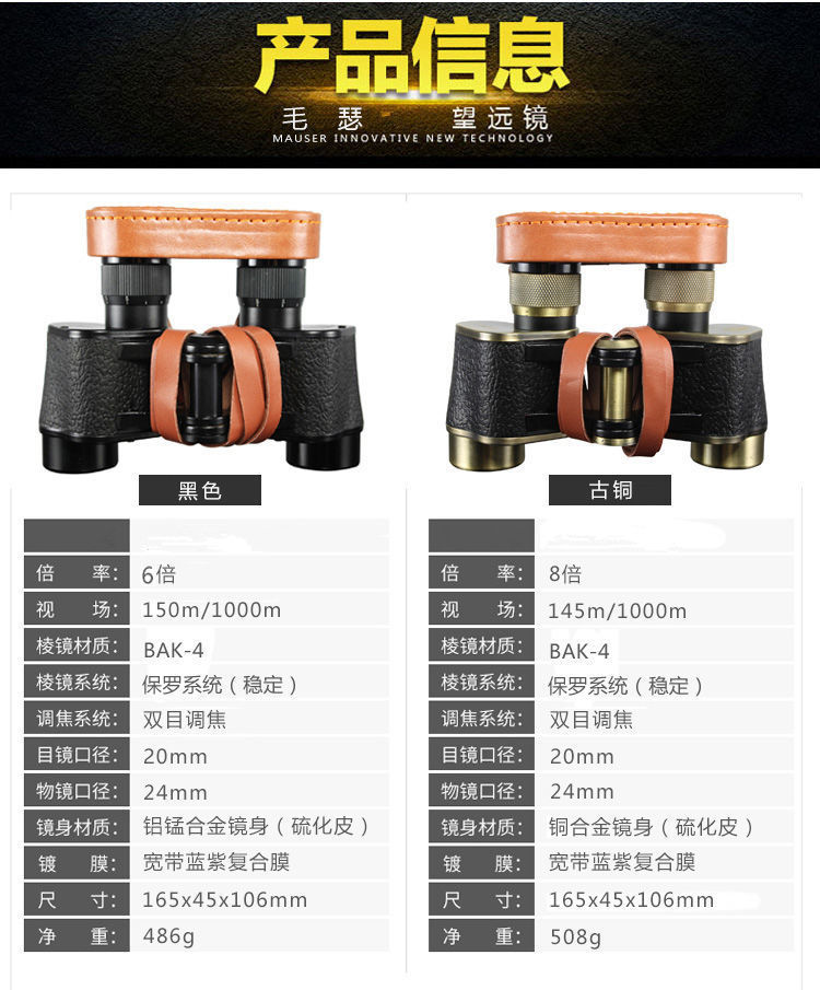 독일 Mauser Telescope Binocular HD 고출력 야간 비전 범위 야외 휴대용 모든 금속 콘서트 lid