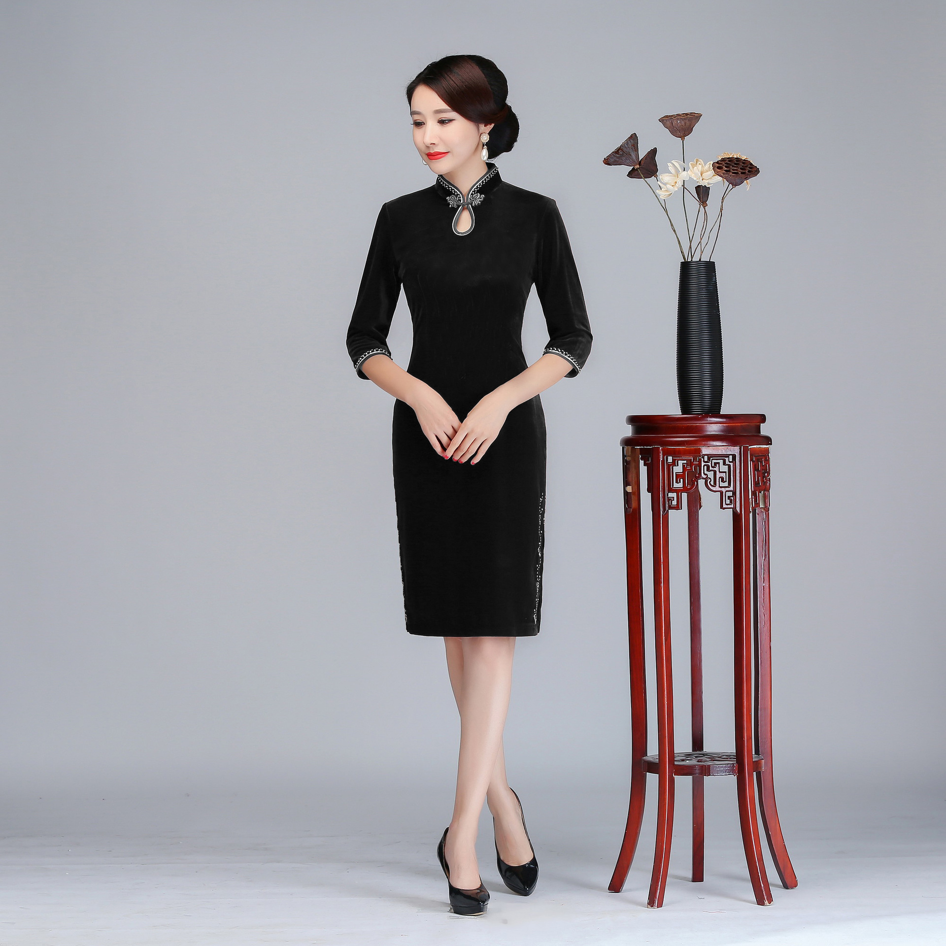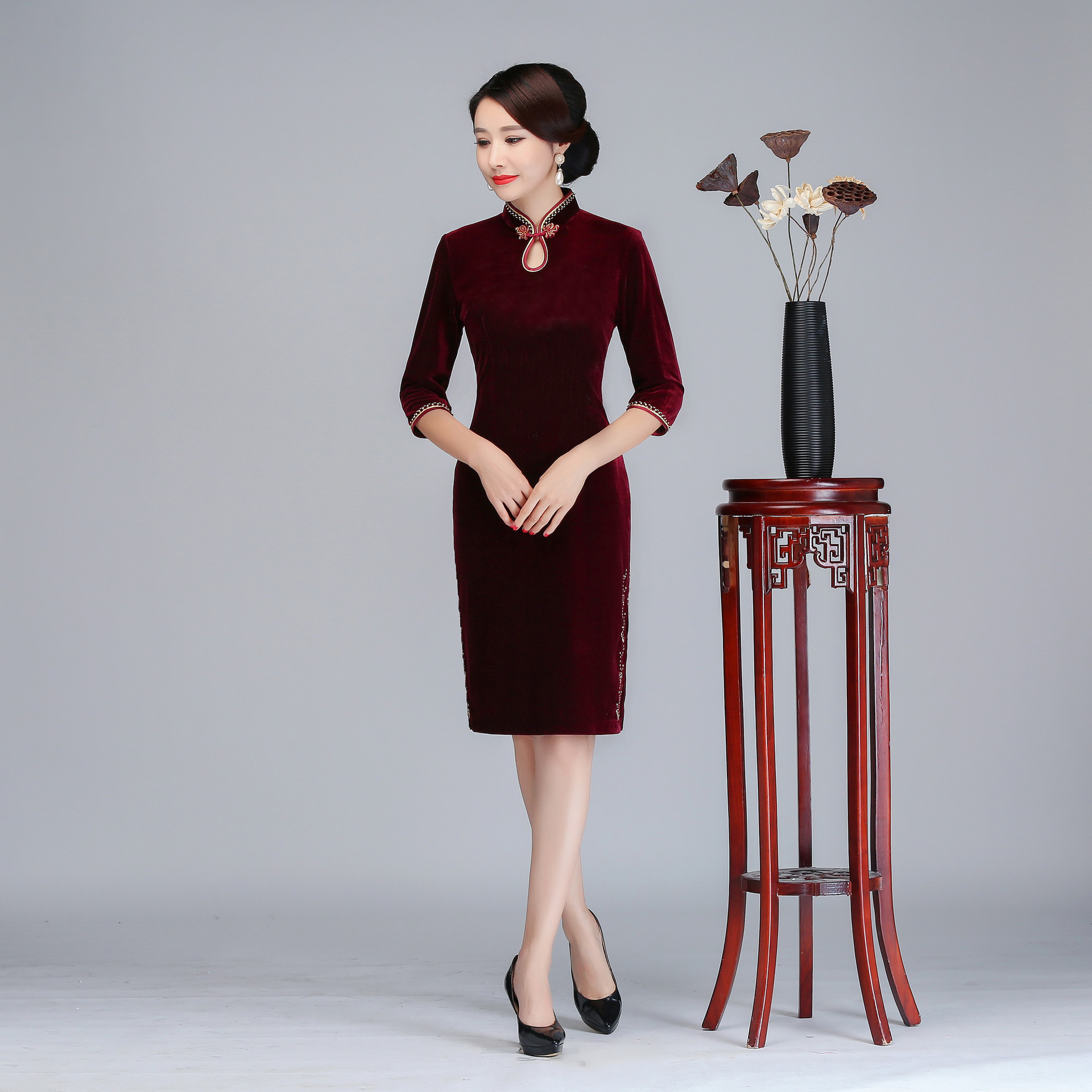2024 구슬 장식 가을 겨울 새로운 스타일 벨벳 치파오 짧은 중간 소매 복고풍 건배 어머니 치파오 드레스 개선스토어 가기