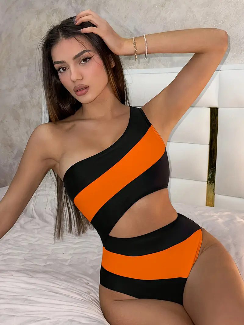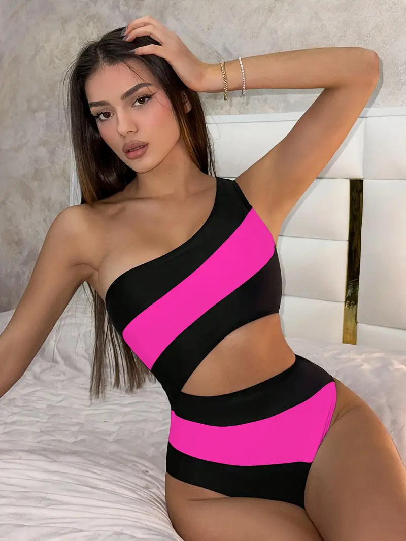 2024 새로운 비키니 크로스 보더 유럽과 미국의 흑백 컬러 매칭 패션 속이 빈 섹시한 원피스 비키니 수영복 여성