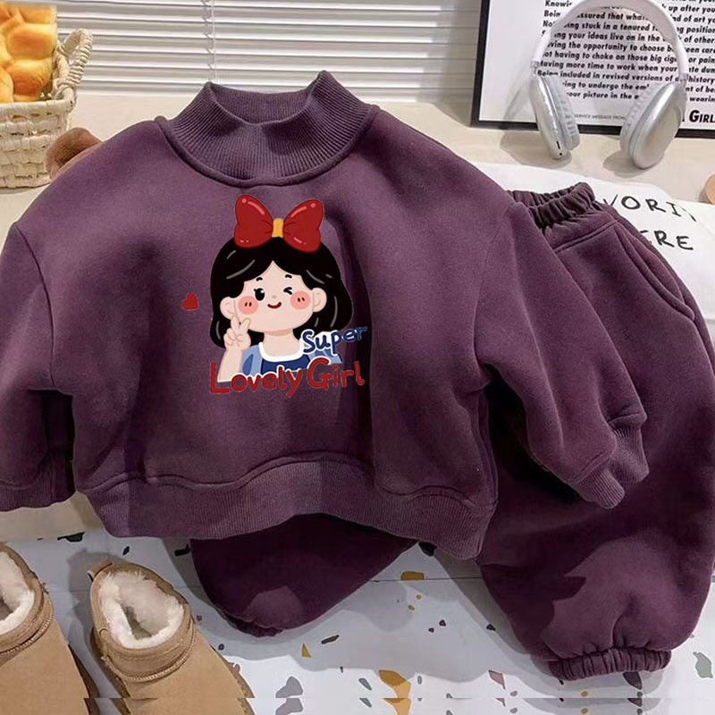 어린이 소녀 겨울 스웨트 셔츠 기모 두꺼운 세트 새로운 한국식 아기 귀여운 만화 캐주얼 투피스 세트