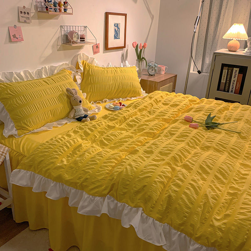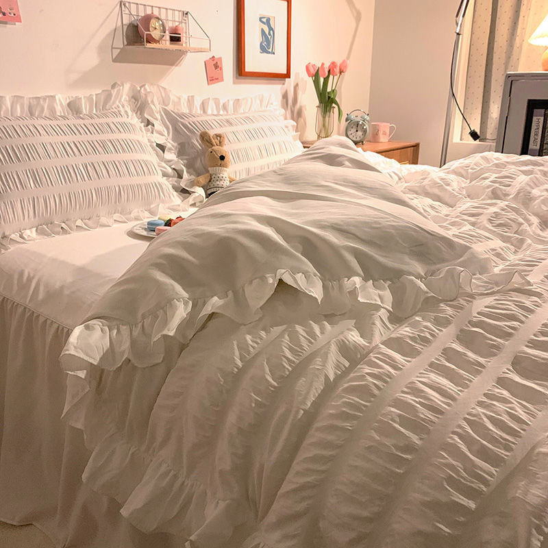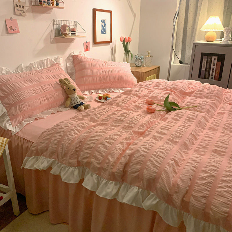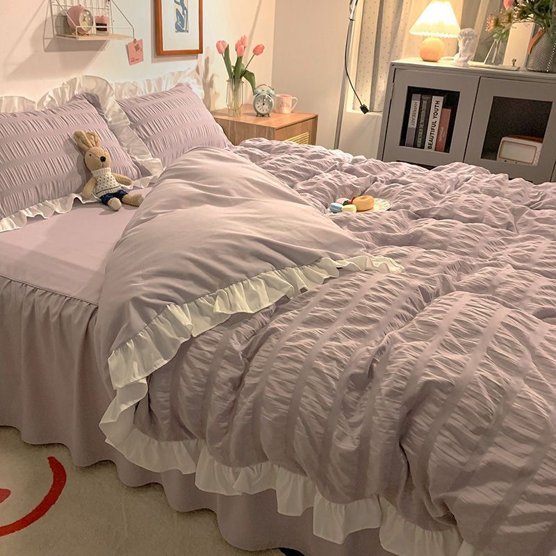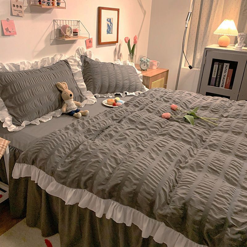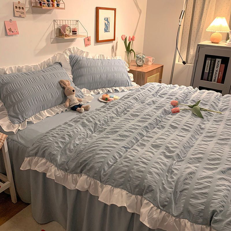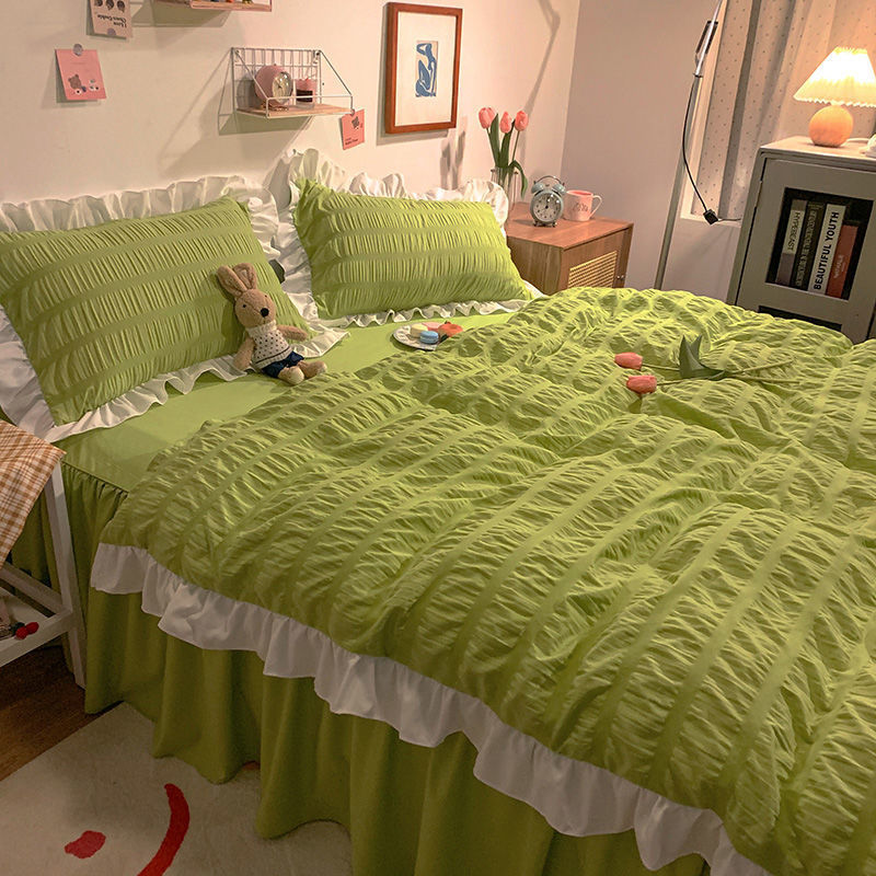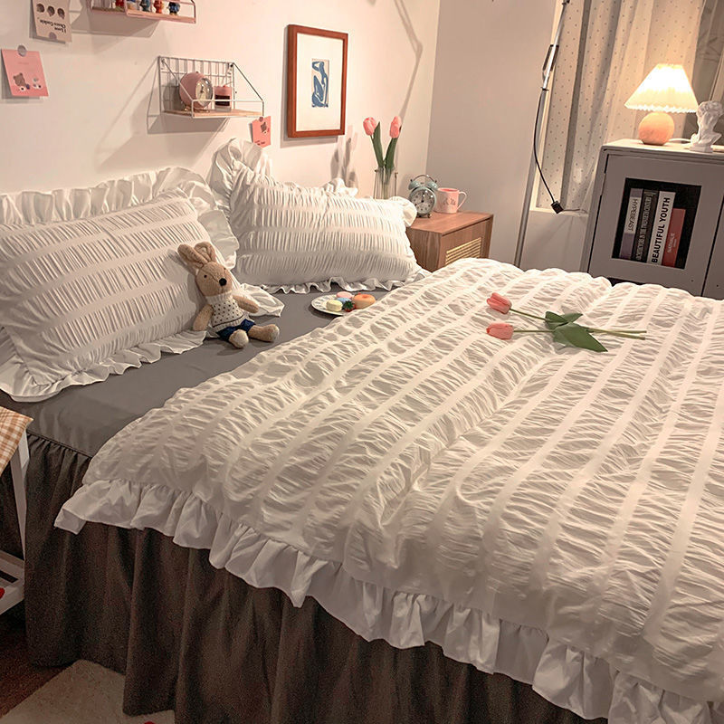 한국식 공주 스타일 침대 스커트 4 종 세트 세척 된 주름 원사 레이스 침대 시트 퀼트 커버 봄과 여름 학생 기숙사 3 종 세트