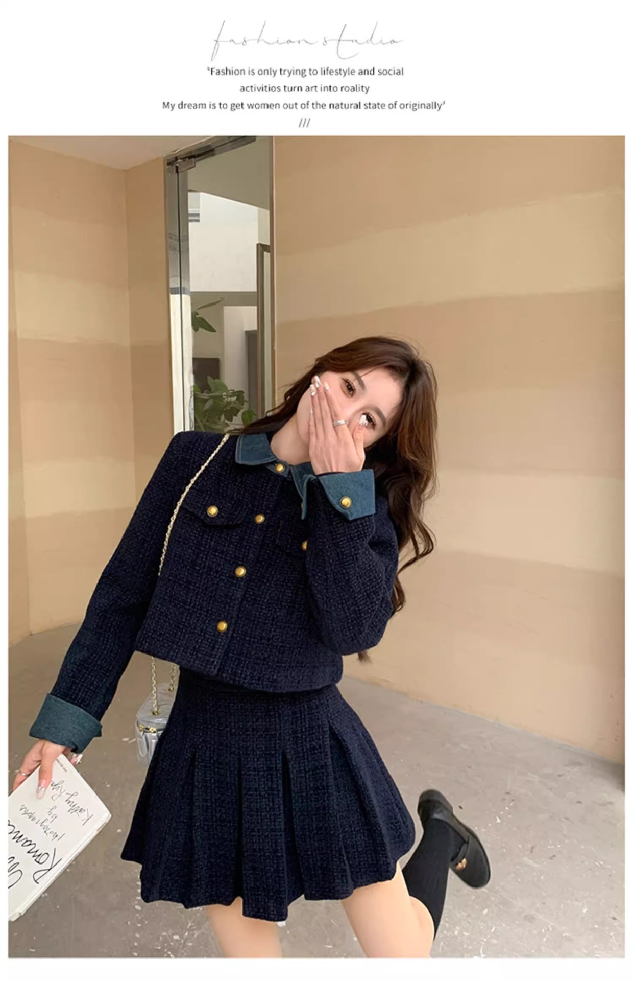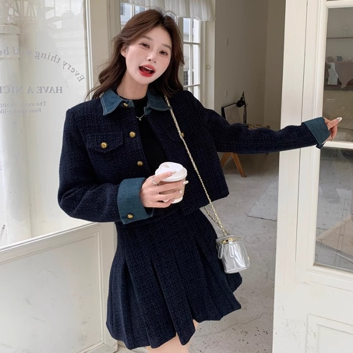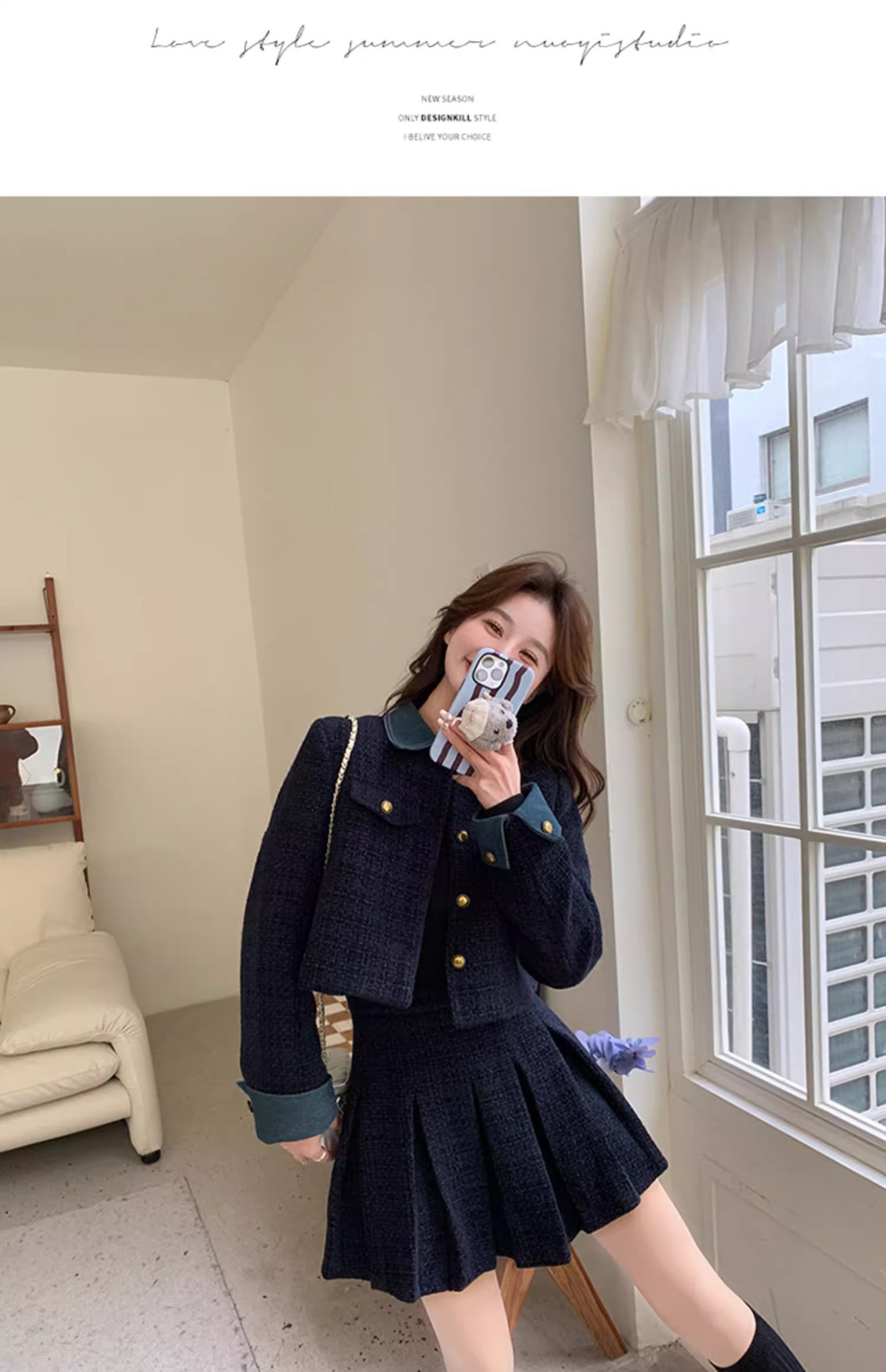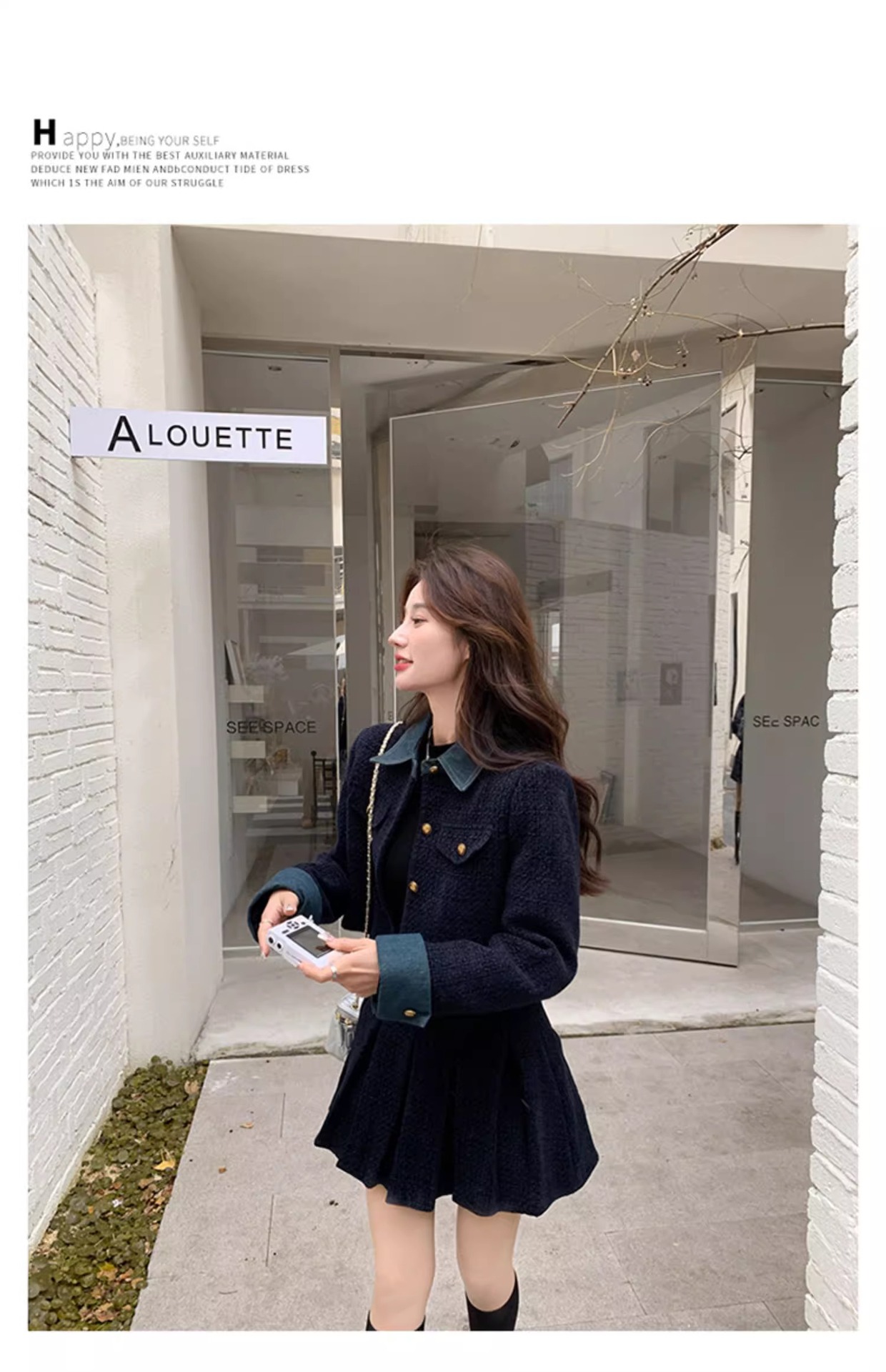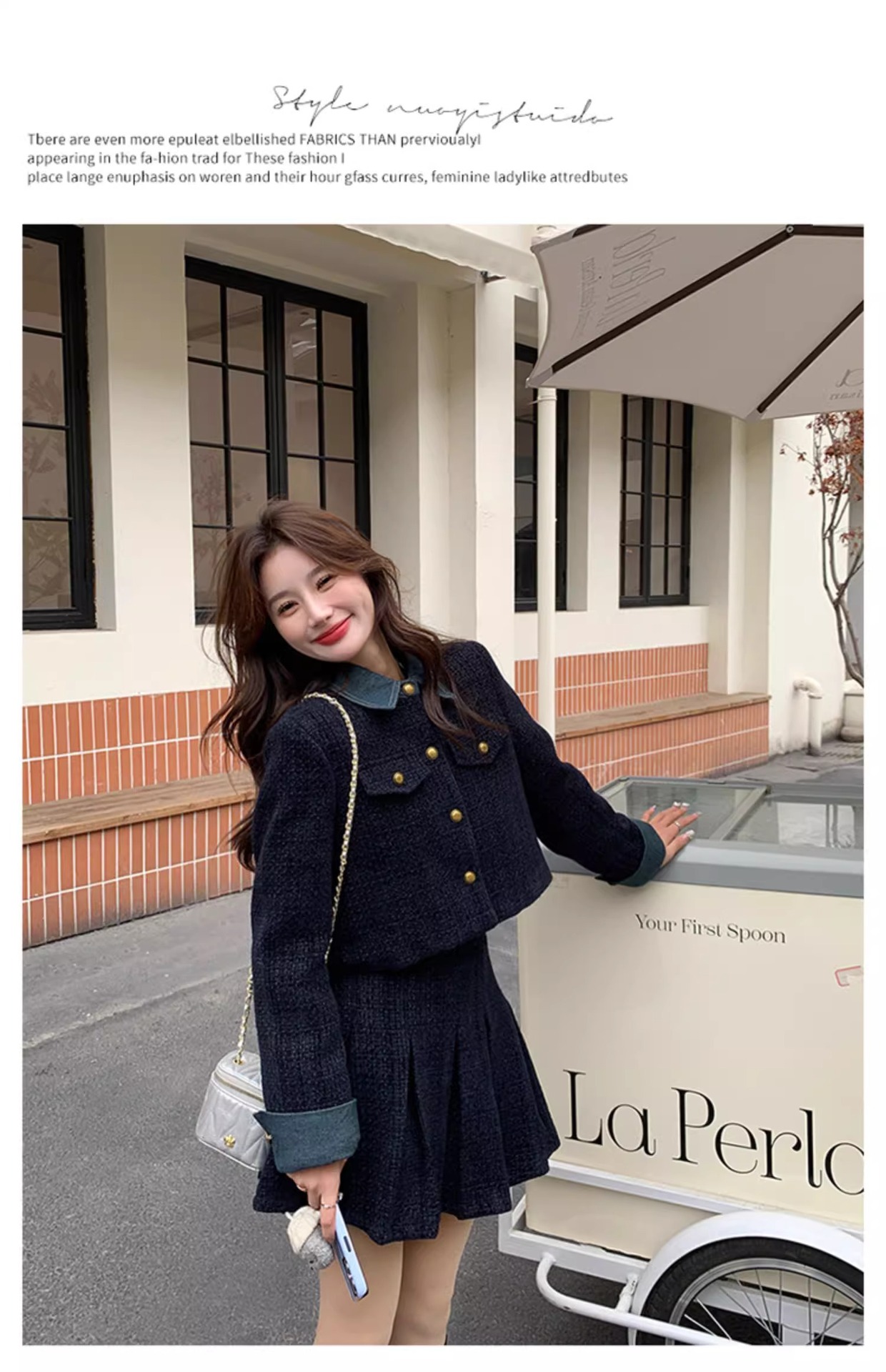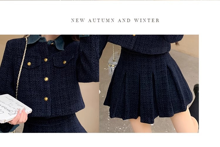 샤넬 스타일 두꺼운 코튼 패셔너블 세트 여성용 2024 겨울 새 울 코트 주름 스커트 투피스 세트 트렌디스토어 가기