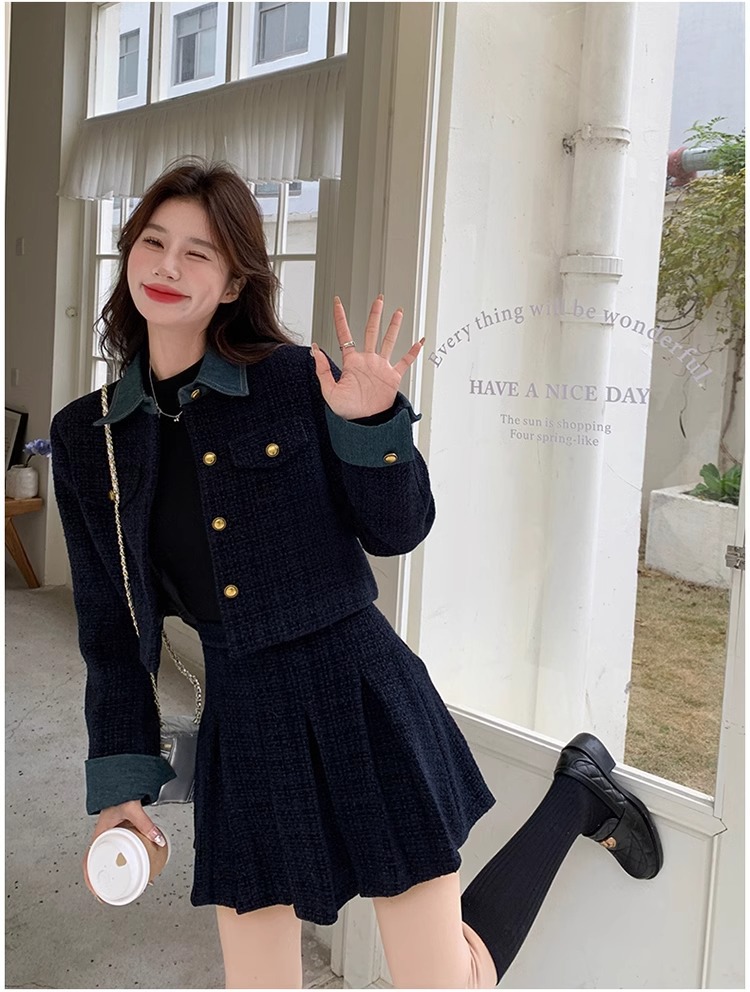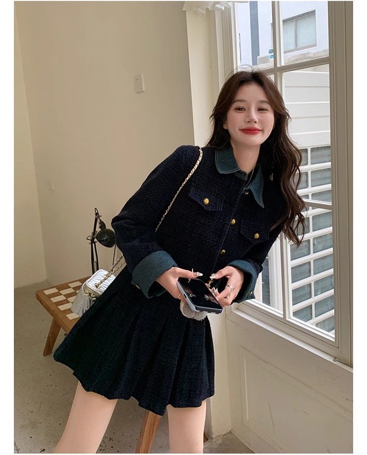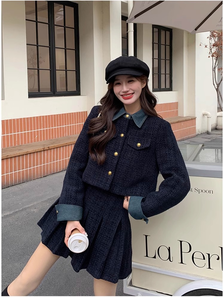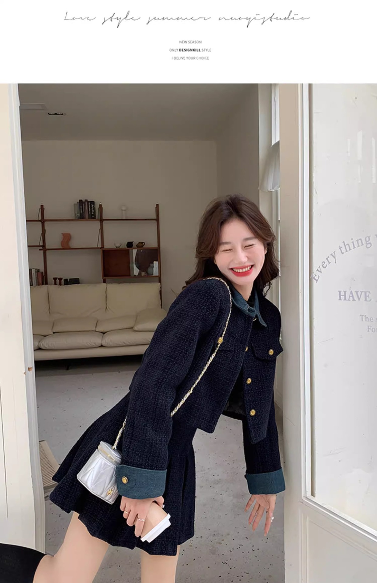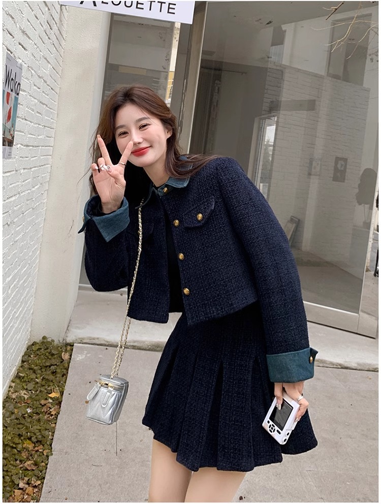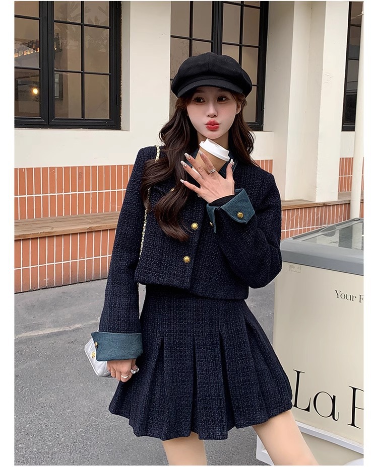 샤넬 스타일 두꺼운 코튼 패셔너블 세트 여성용 2024 겨울 새 울 코트 주름 스커트 투피스 세트 트렌디스토어 가기