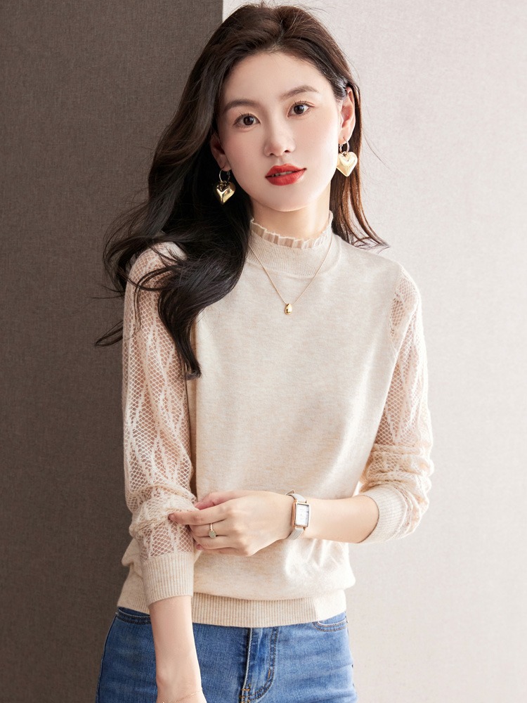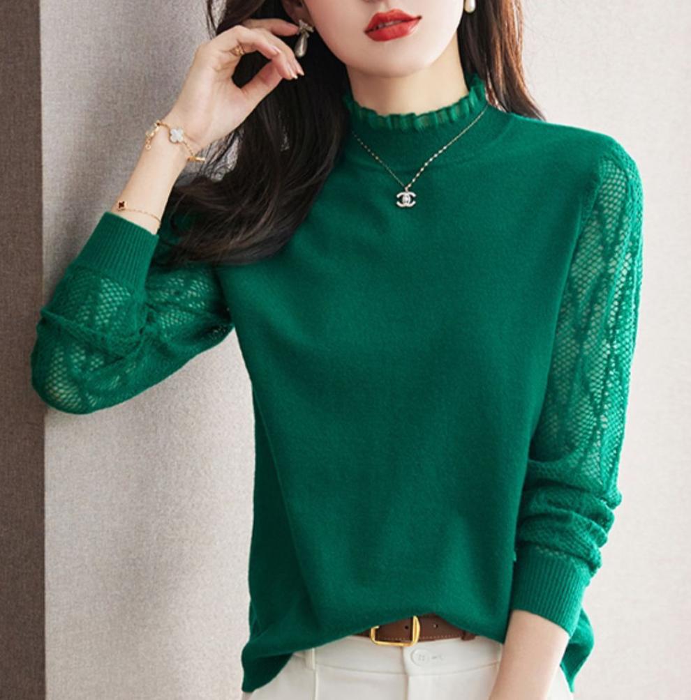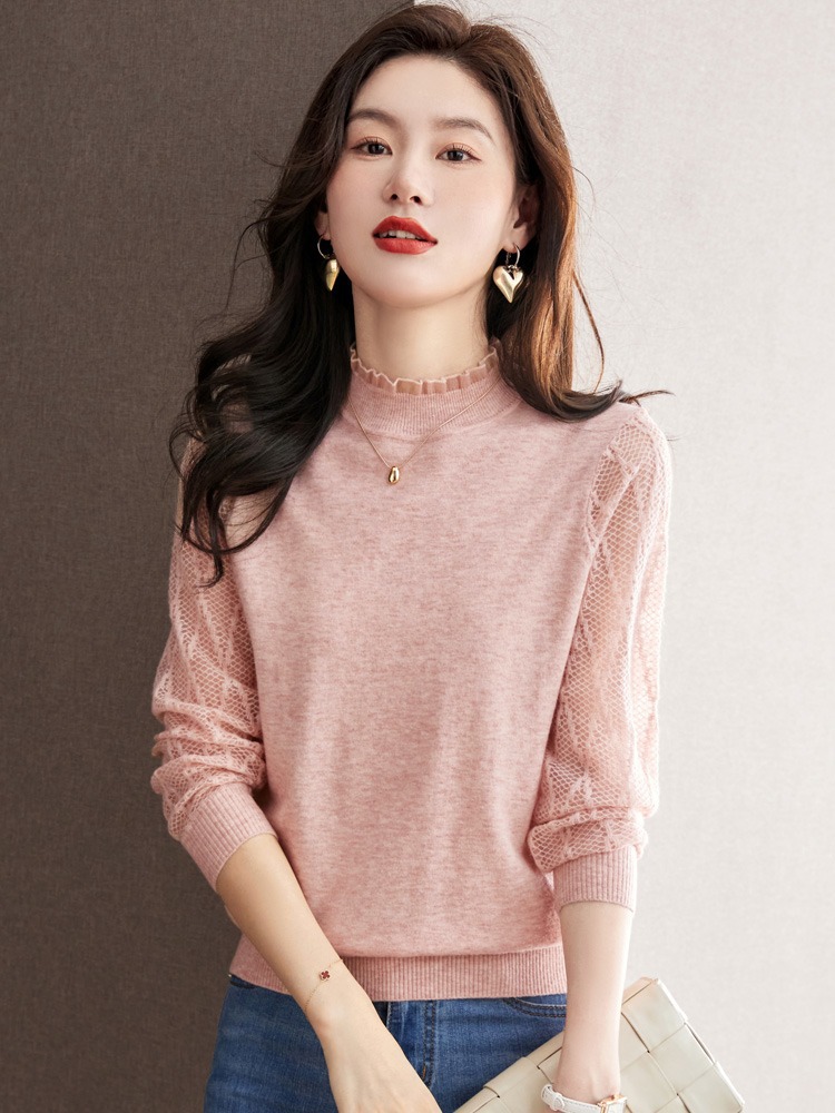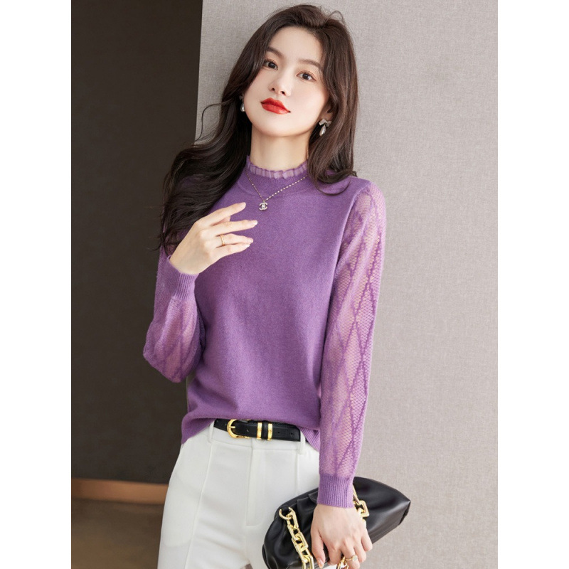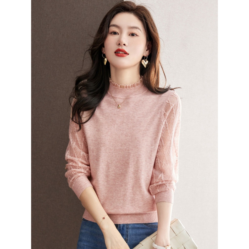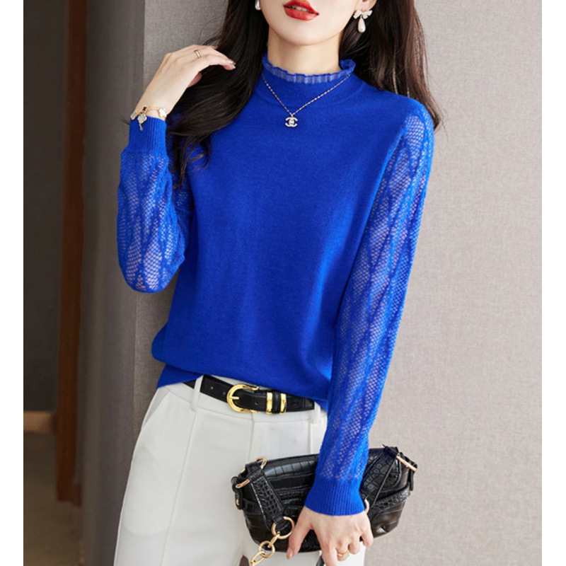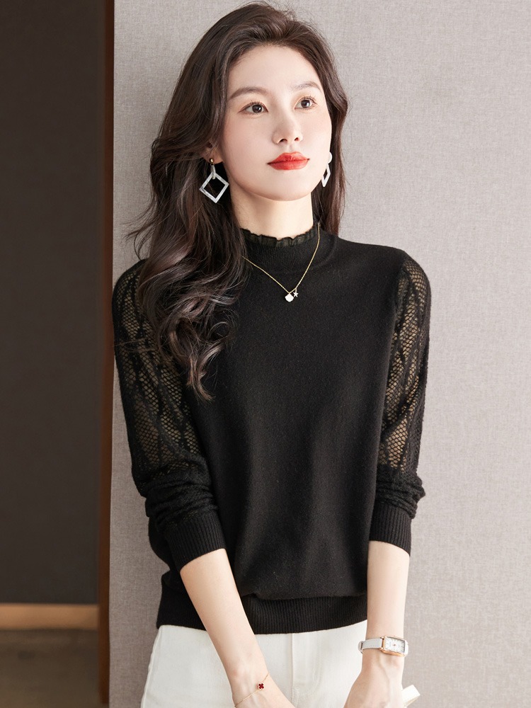 하프 하이 칼라 레이스베이스 셔츠 여자의 봄 2024 새로운 내부 탑 니트 셔츠 블랙 스웨터 봄스토어 가기