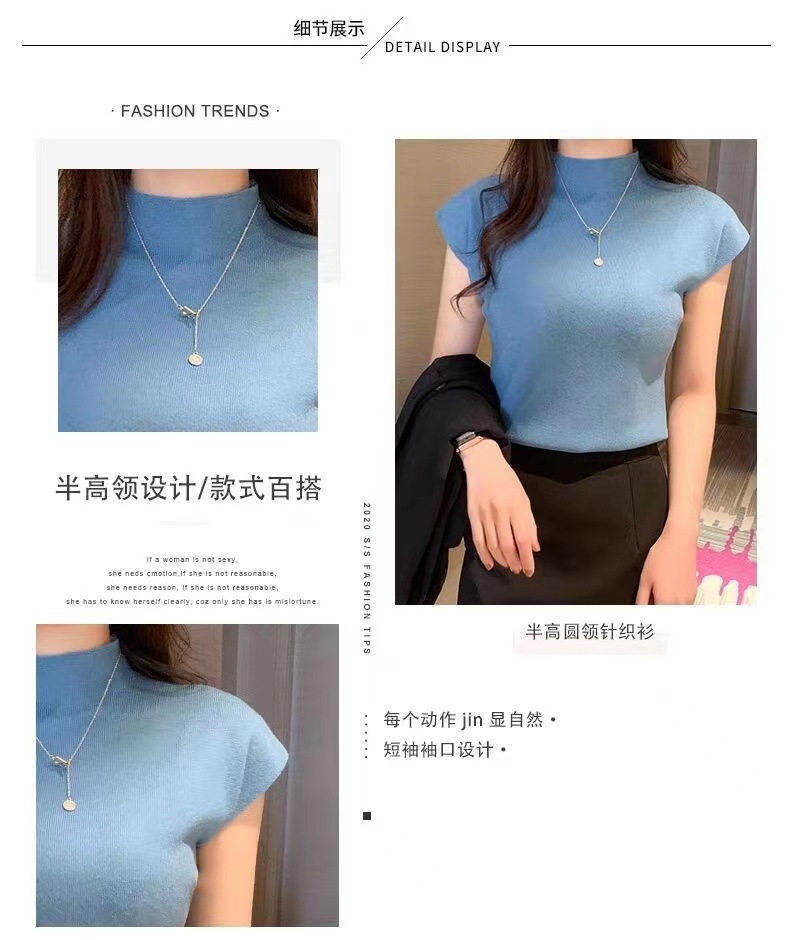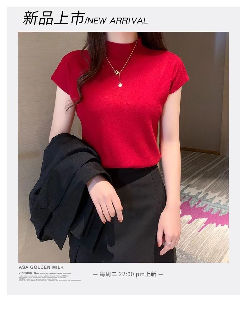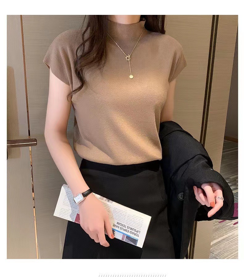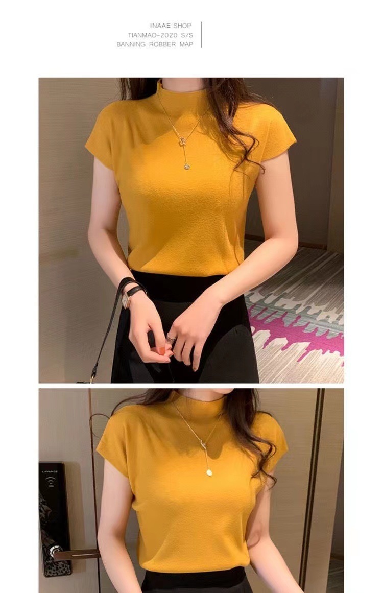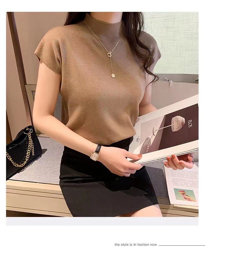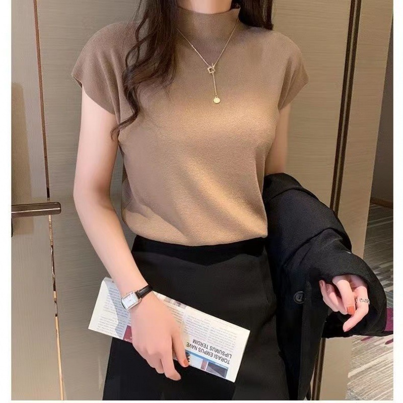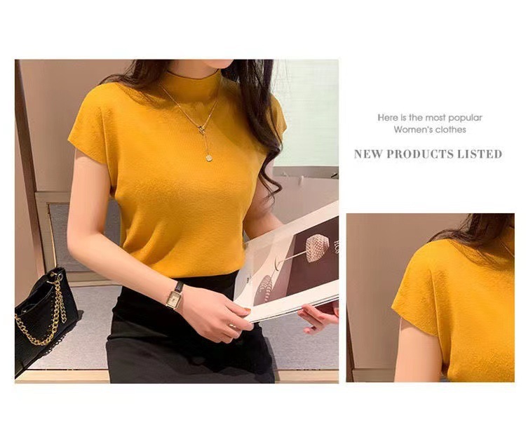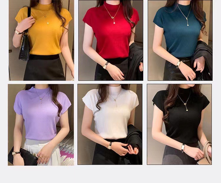 아이스 실크 니트 스웨터 하이 엔드 티셔츠 여성용 반팔 2023 새로운 여름 얇은 서양식 하프 하이 칼라베이스 셔츠 탑스토어 가기