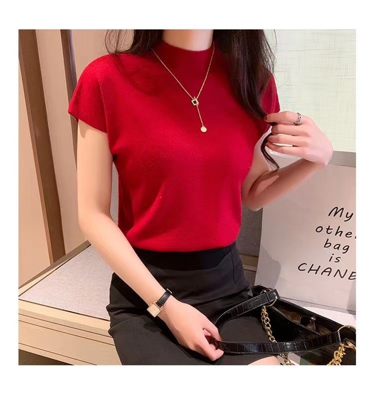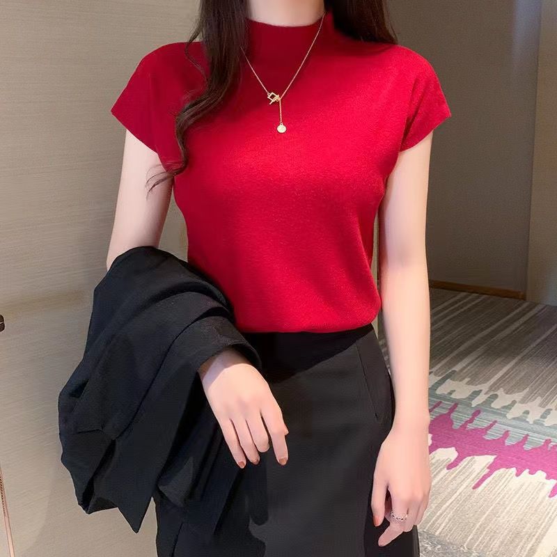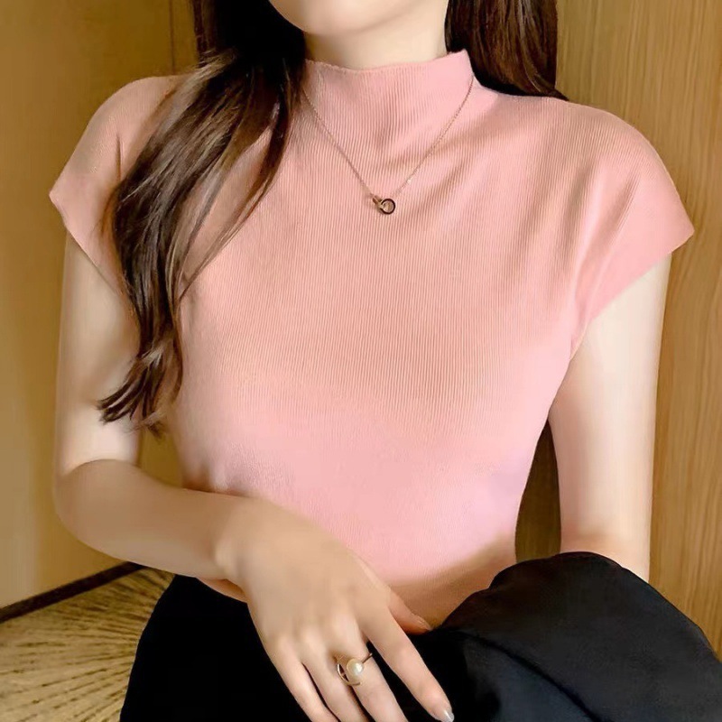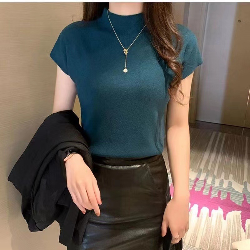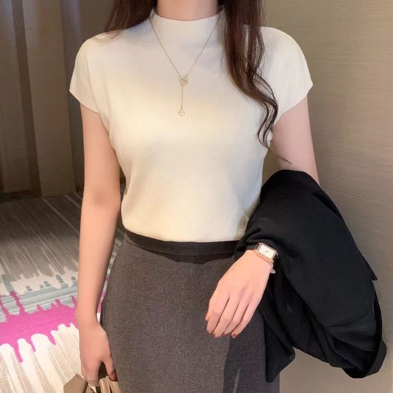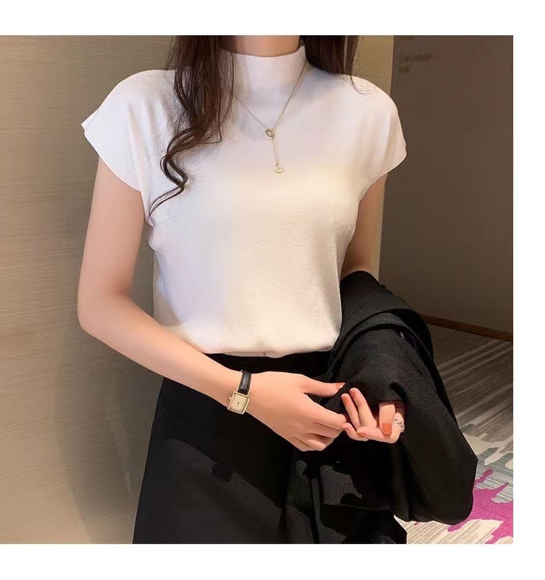 아이스 실크 니트 스웨터 하이 엔드 티셔츠 여성용 반팔 2023 새로운 여름 얇은 서양식 하프 하이 칼라베이스 셔츠 탑