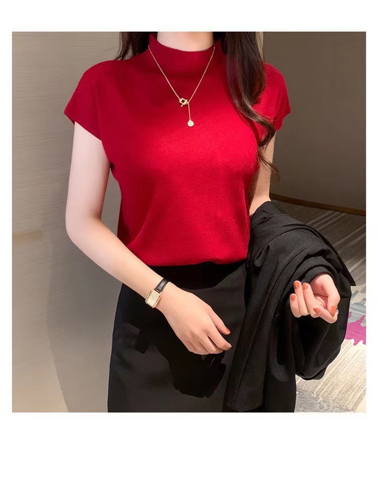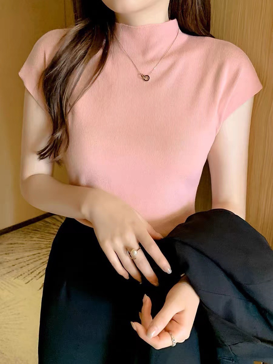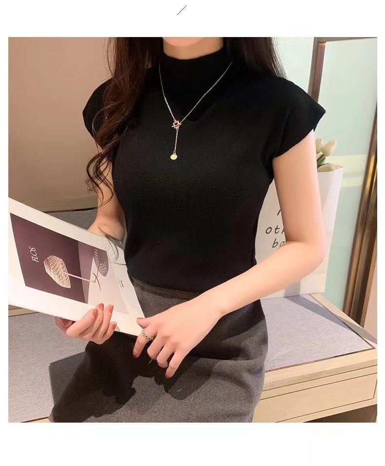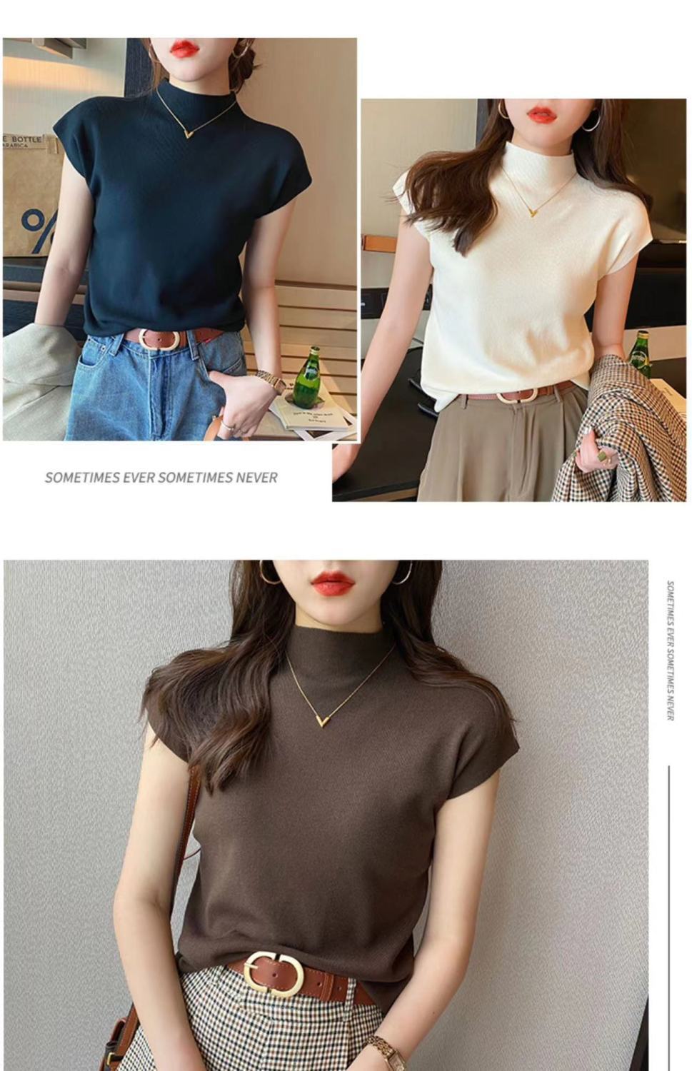 아이스 실크 니트 스웨터 하이 엔드 티셔츠 여성용 반팔 2023 새로운 여름 얇은 서양식 하프 하이 칼라베이스 셔츠 탑