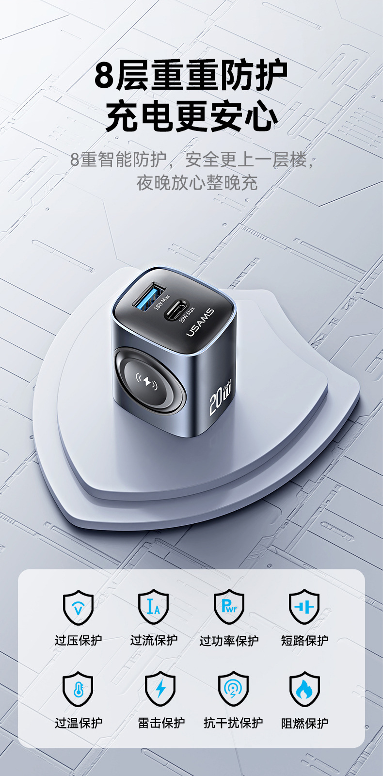 USAMS pd20w 갈륨 질화물 고속 충전 헤드 미국 및 유럽 게이지 충전 헤드 휴대 전화 충전기 시계 무선 충전 교차 국경