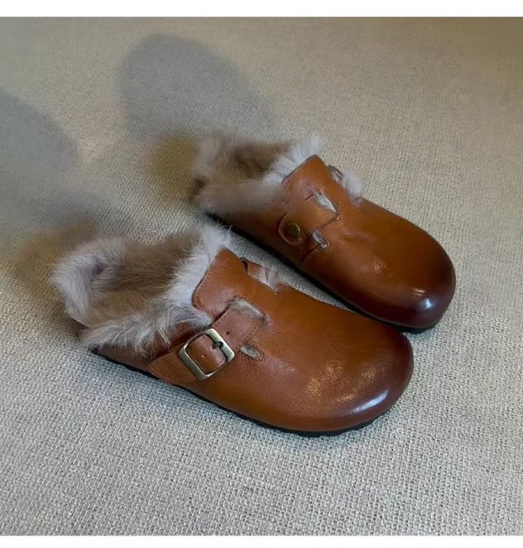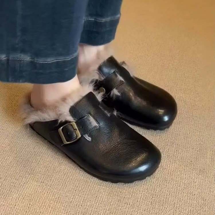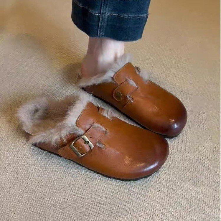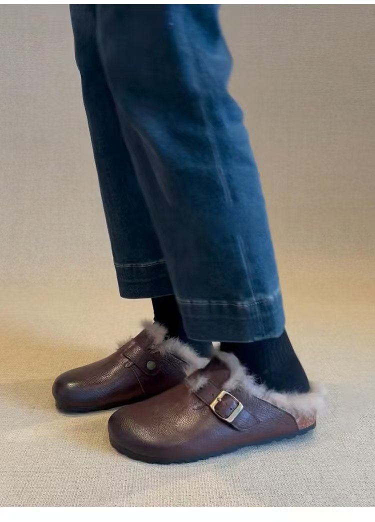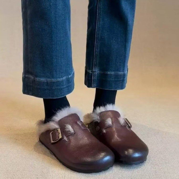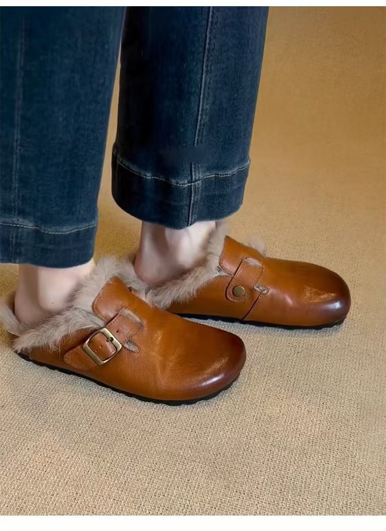 빈티지 벨트 버클 컬러 폴리싱 마오 마오 버켄 신발 여성의 2024 가을/겨울 게으른 편안한 슬립 온 플러스 사이즈 코튼 슈즈