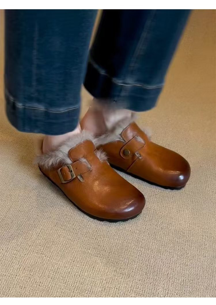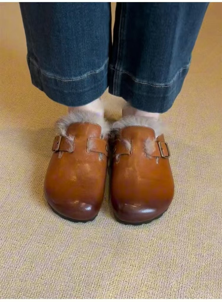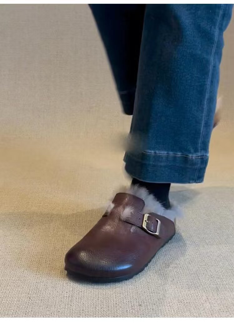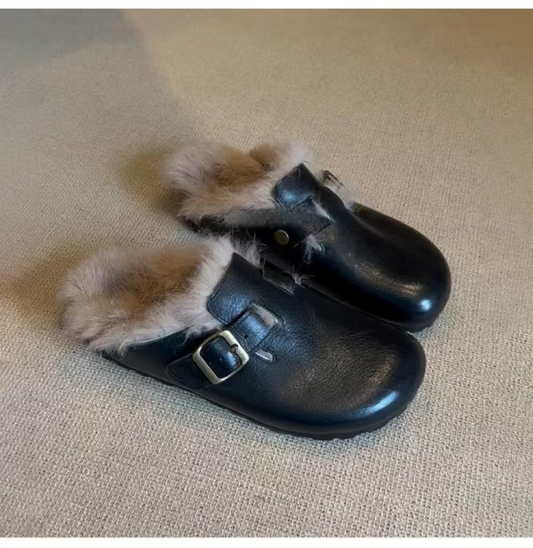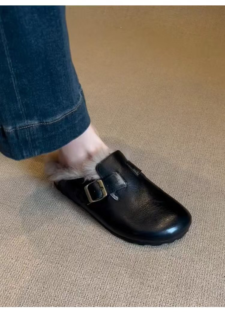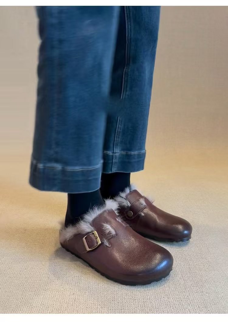 빈티지 벨트 버클 컬러 폴리싱 마오 마오 버켄 신발 여성의 2024 가을/겨울 게으른 편안한 슬립 온 플러스 사이즈 코튼 슈즈