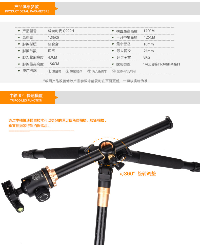 라이트 나이 Q999H 오버 헤드 삼각대 카메라 SLR 휴대 전화 휴대용 사진 센터 축 수평 삼각형 브래킷스토어 가기