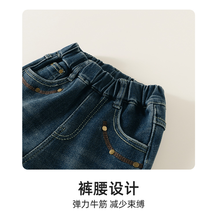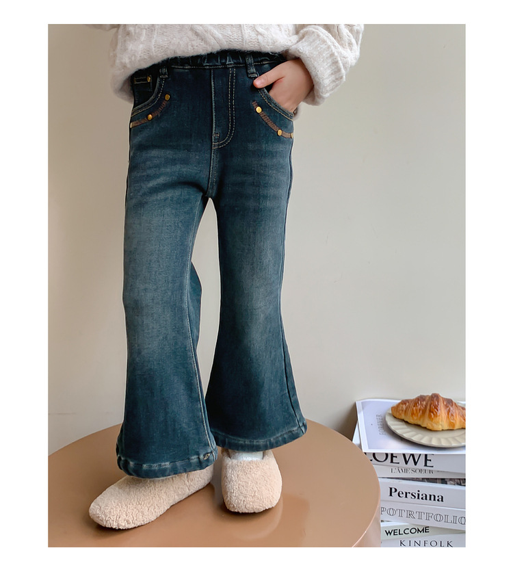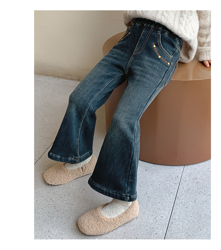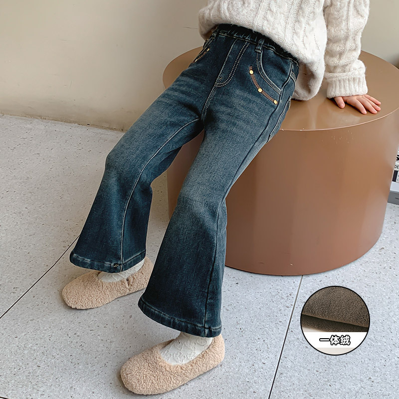 여아용 겨울 기모 데님 팬츠, 2025년 가을 겨울 신상 아동용 일체형 기모 바지, 여자아이들을 위한 세련된 나팔바지