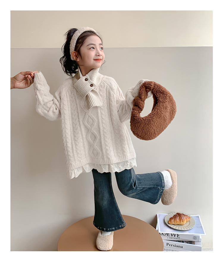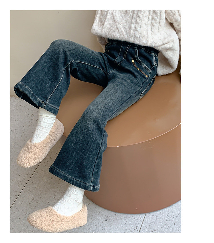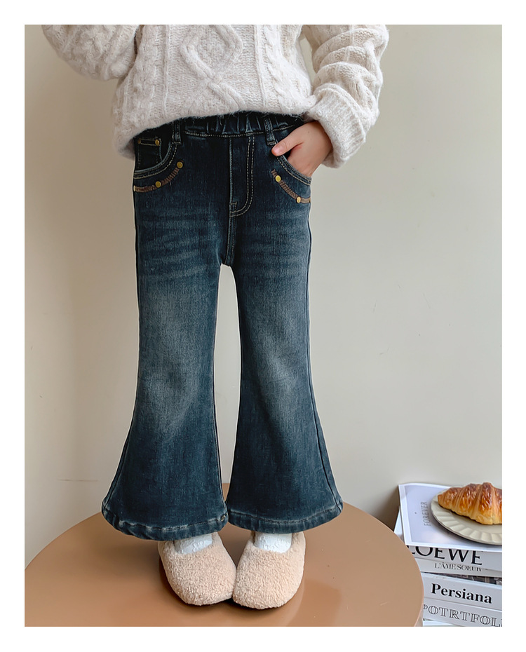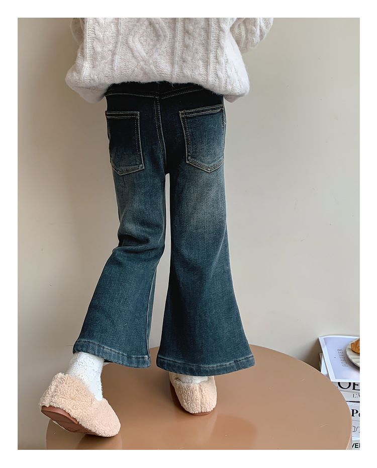 여아용 겨울 기모 데님 팬츠, 2025년 가을 겨울 신상 아동용 일체형 기모 바지, 여자아이들을 위한 세련된 나팔바지스토어 가기