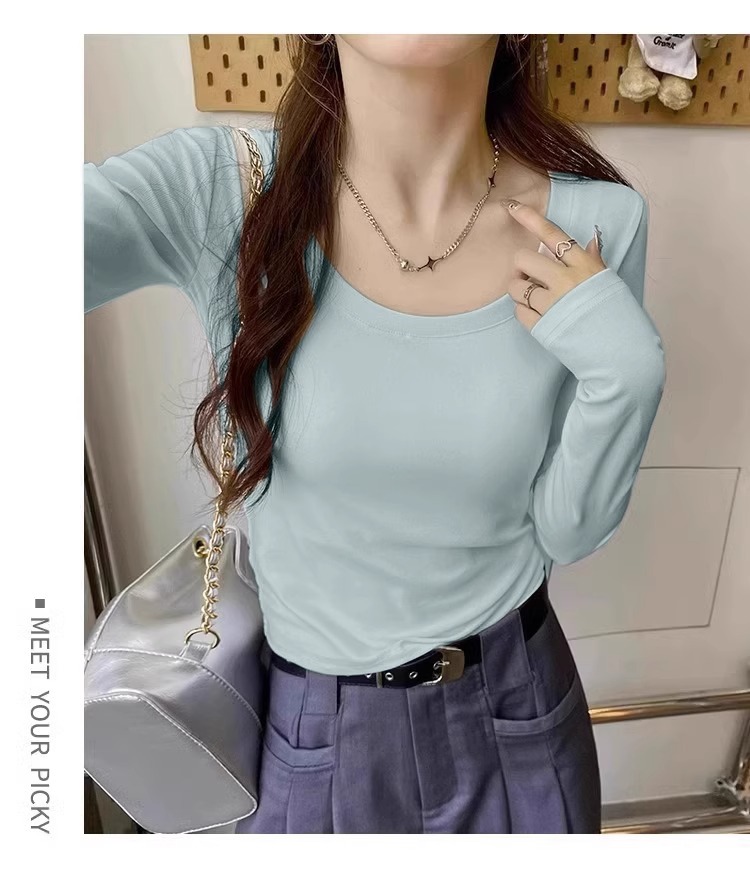 가을과 겨울 새로운 긴팔 벨벳 따뜻한 내베이스 셔츠 여성용 솔리드 컬러 U 칼라 슬림핏 슬리밍 우아한 올 매치 탑