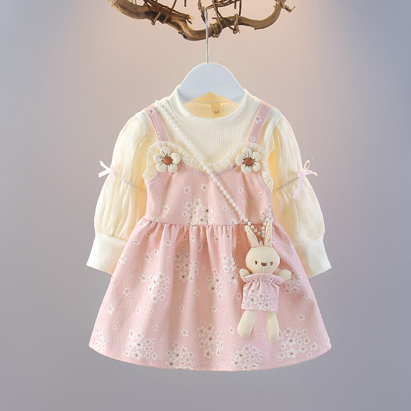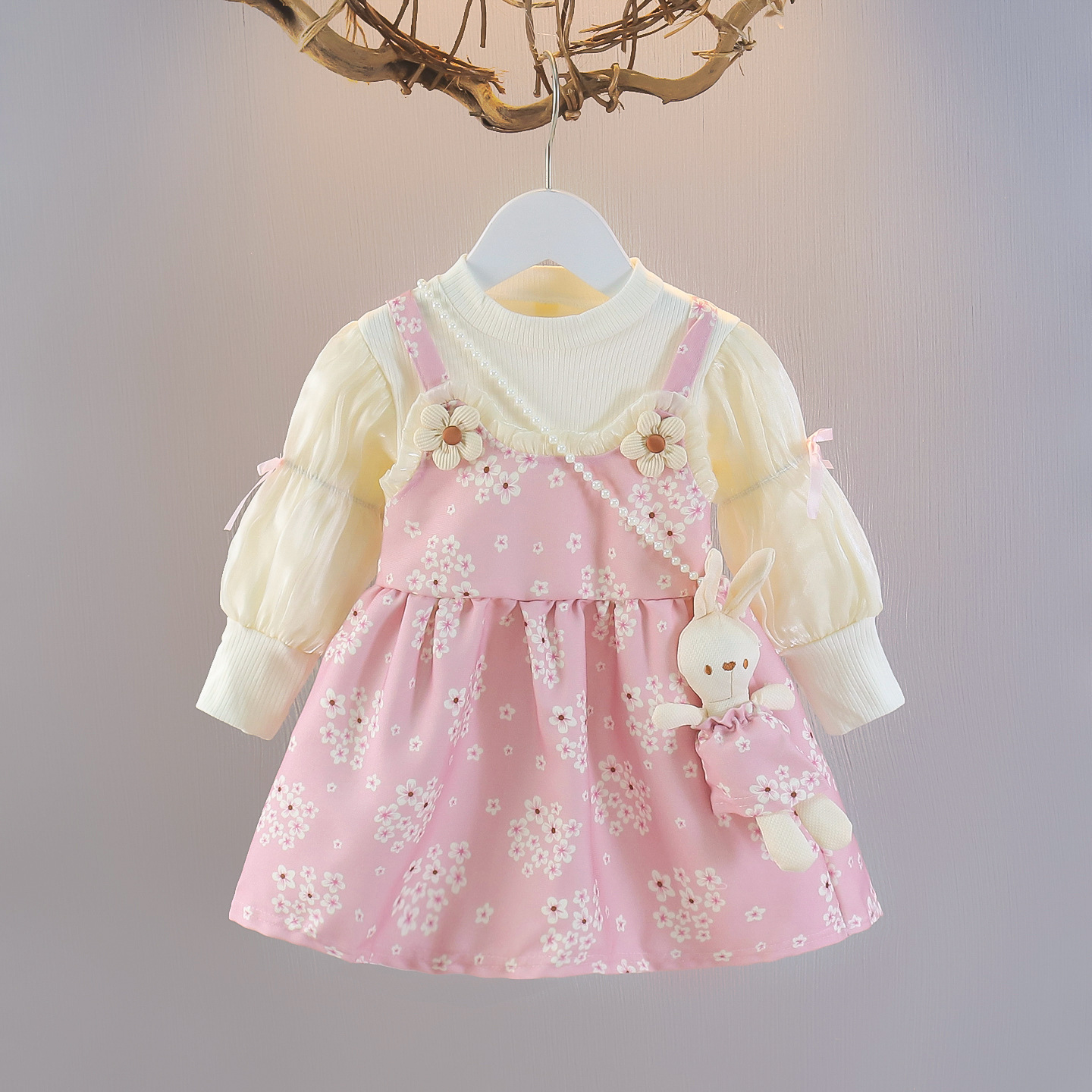 어린이 의류 소녀 원피스 봄과 가을 2024 서양식 아기 소녀 가을 치마 꽃 가짜 2 토끼 조수 보내기