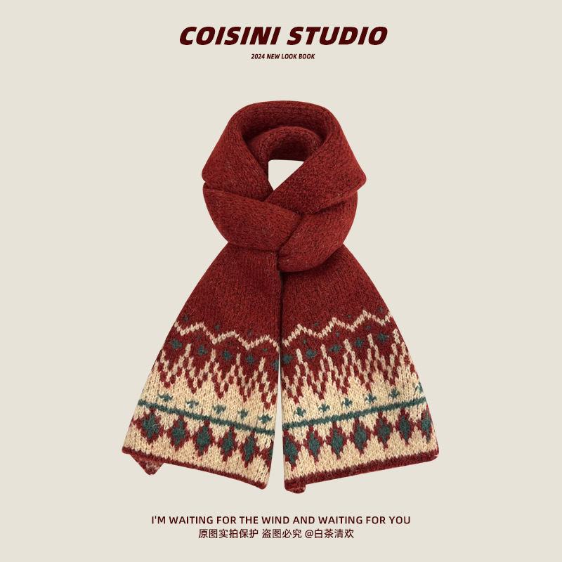 2024 새로운 도착 안코라 레드 자카드 니트 스카프 소녀 따뜻한 겨울 복고풍 화이트 울 넥 패션