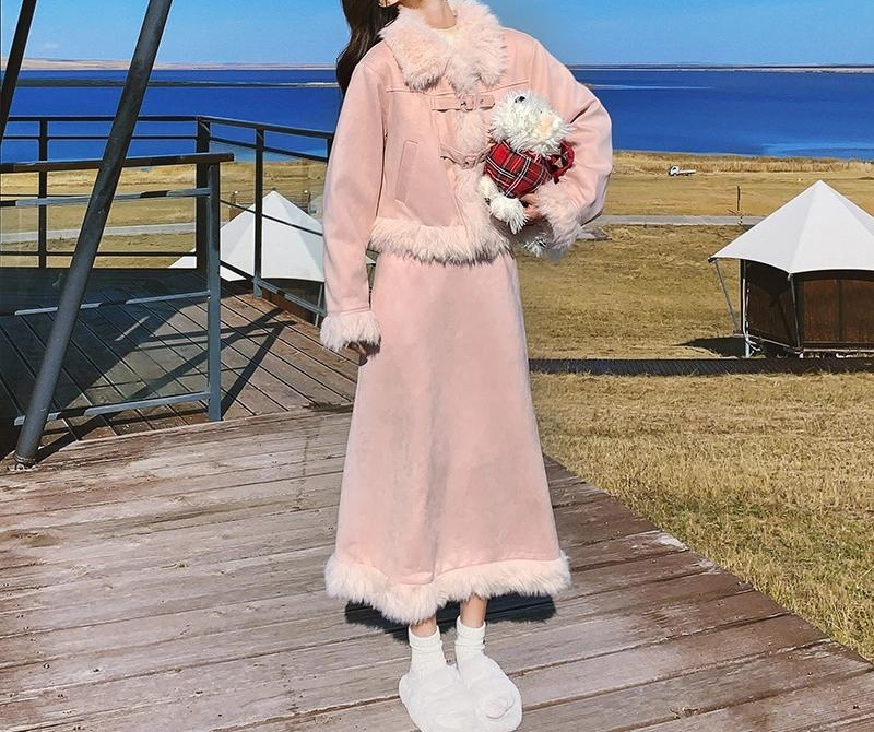 奶呼呼韩系减龄粉色皮绒套装裙2024秋冬毛毛半身裙两件套新款保暖스토어 가기