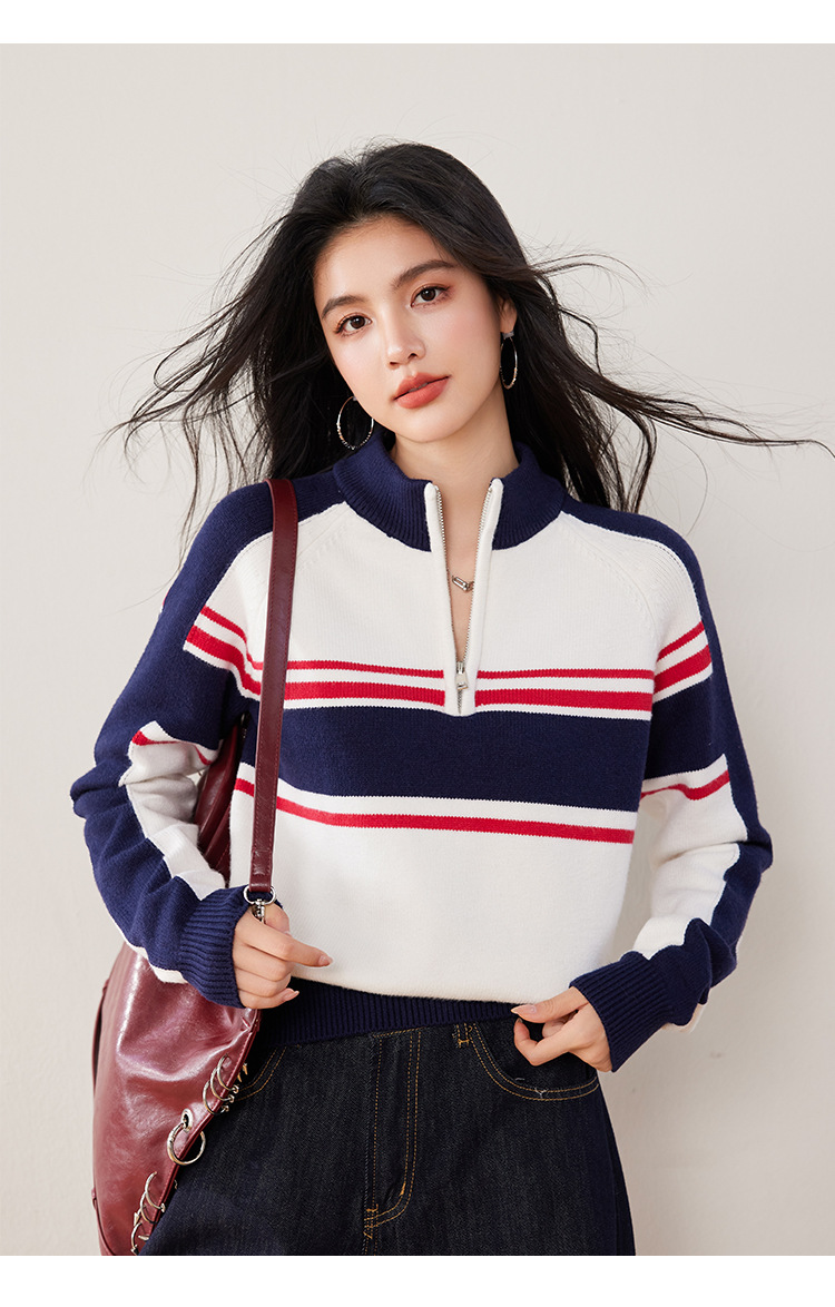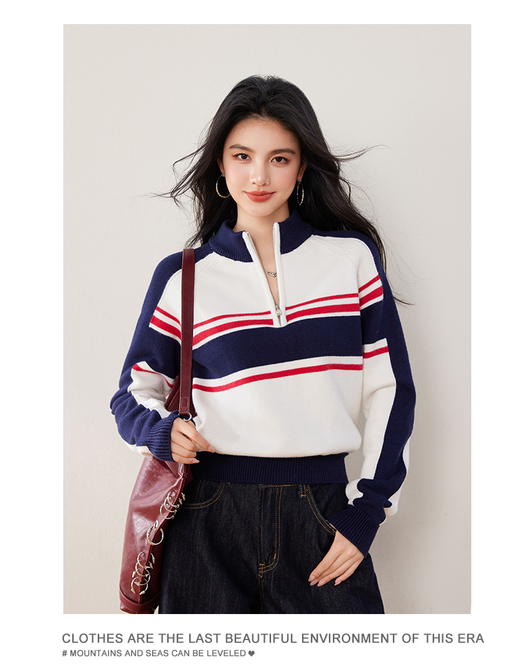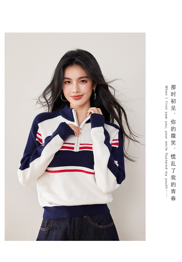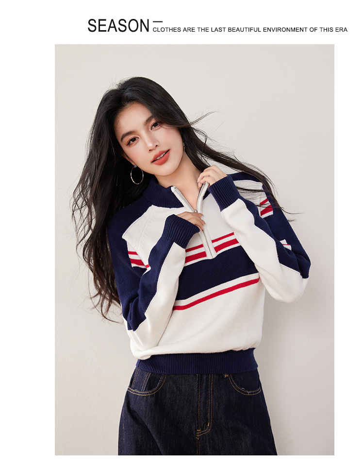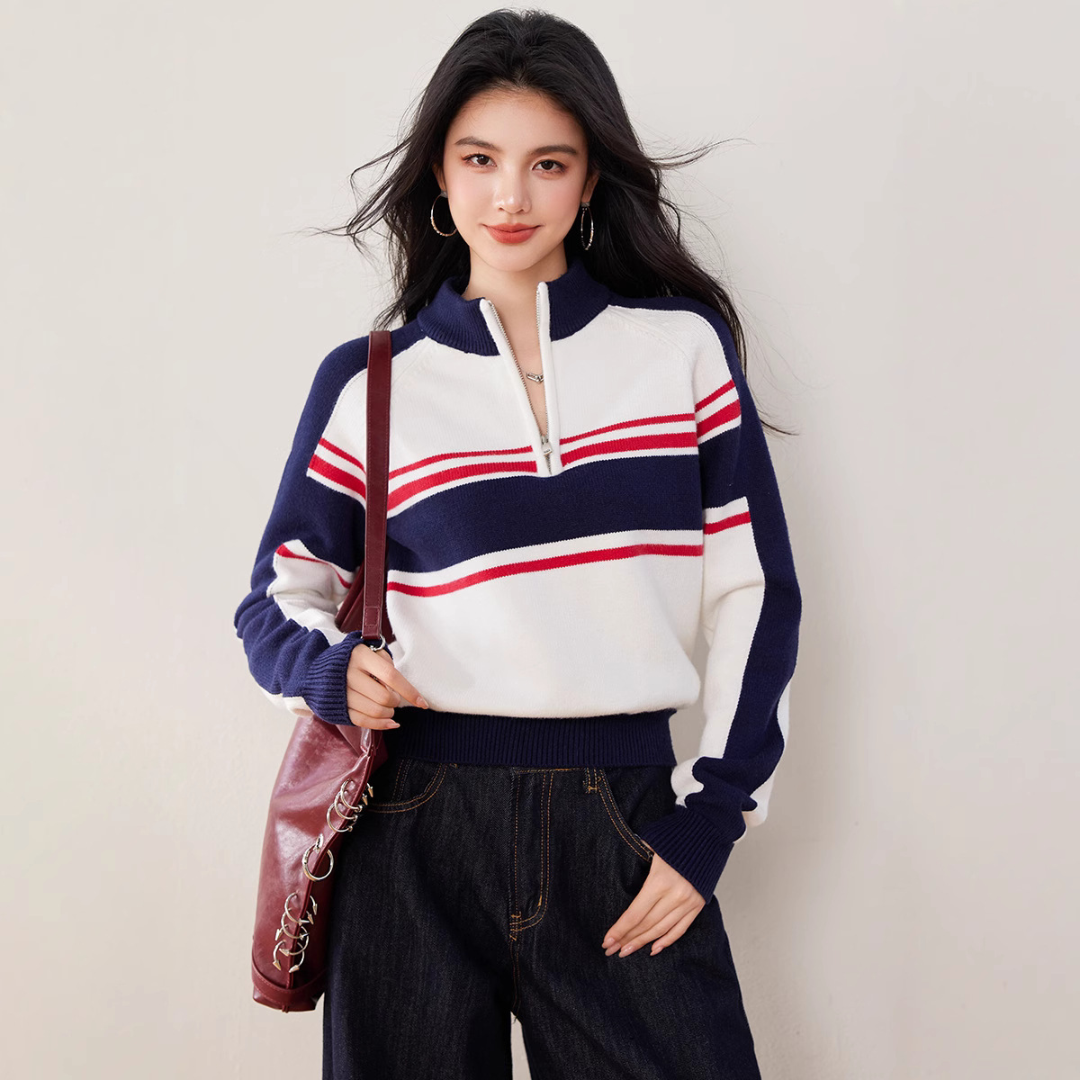 스포티 스타일 스웨터 여성의 2024 겨울 새로운 한국 스타일 패션 다채로운 줄무늬 하프 터틀넥 지퍼 디자인 니트 스웨터