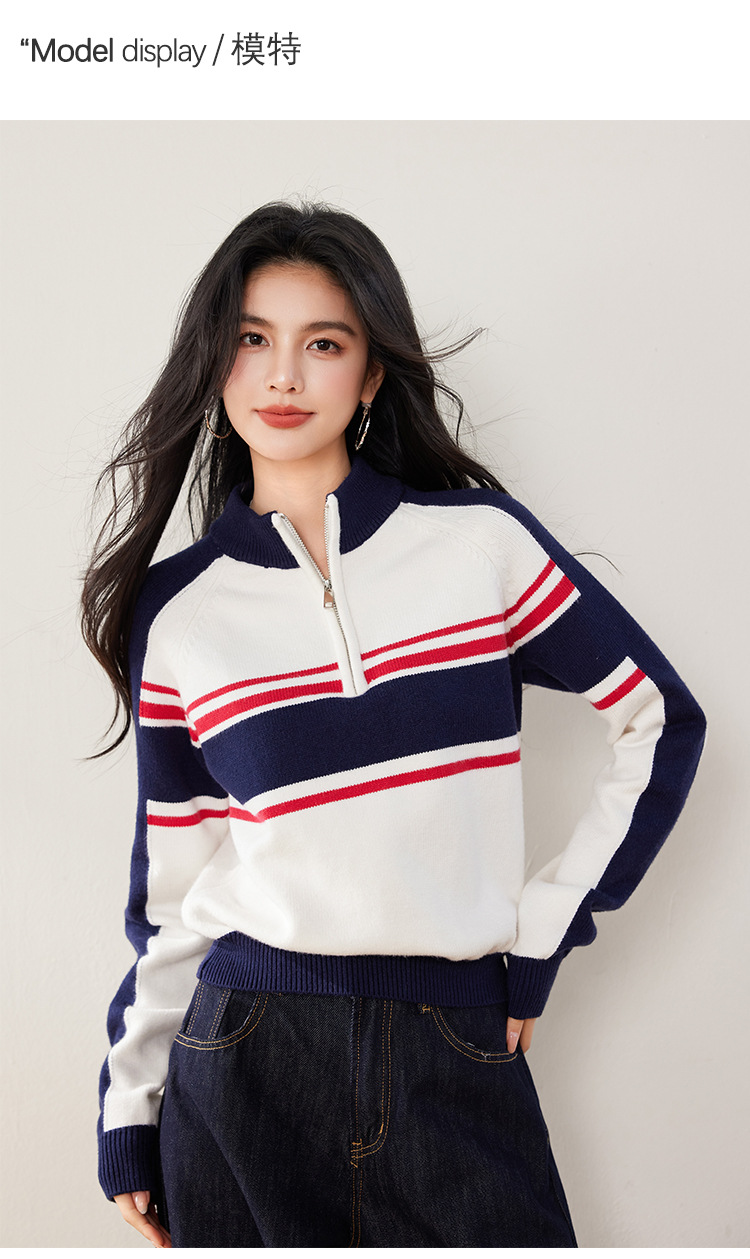 스포티 스타일 스웨터 여성의 2024 겨울 새로운 한국 스타일 패션 다채로운 줄무늬 하프 터틀넥 지퍼 디자인 니트 스웨터스토어 가기