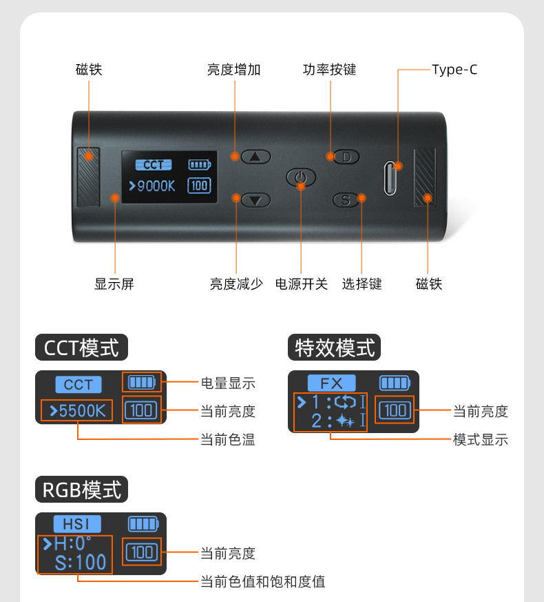 • [마그네틱 RGB 스틱 라이트] (단일 램프 모델) (LCD 화면 없음)