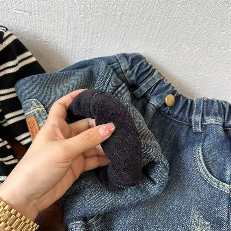 2024 가을과 겨울 소년 소녀를위한 새로운 어린이 기모 바지 중소형 어린이 아기 느슨한 부드러운 청바지에 두꺼운 바지스토어 가기