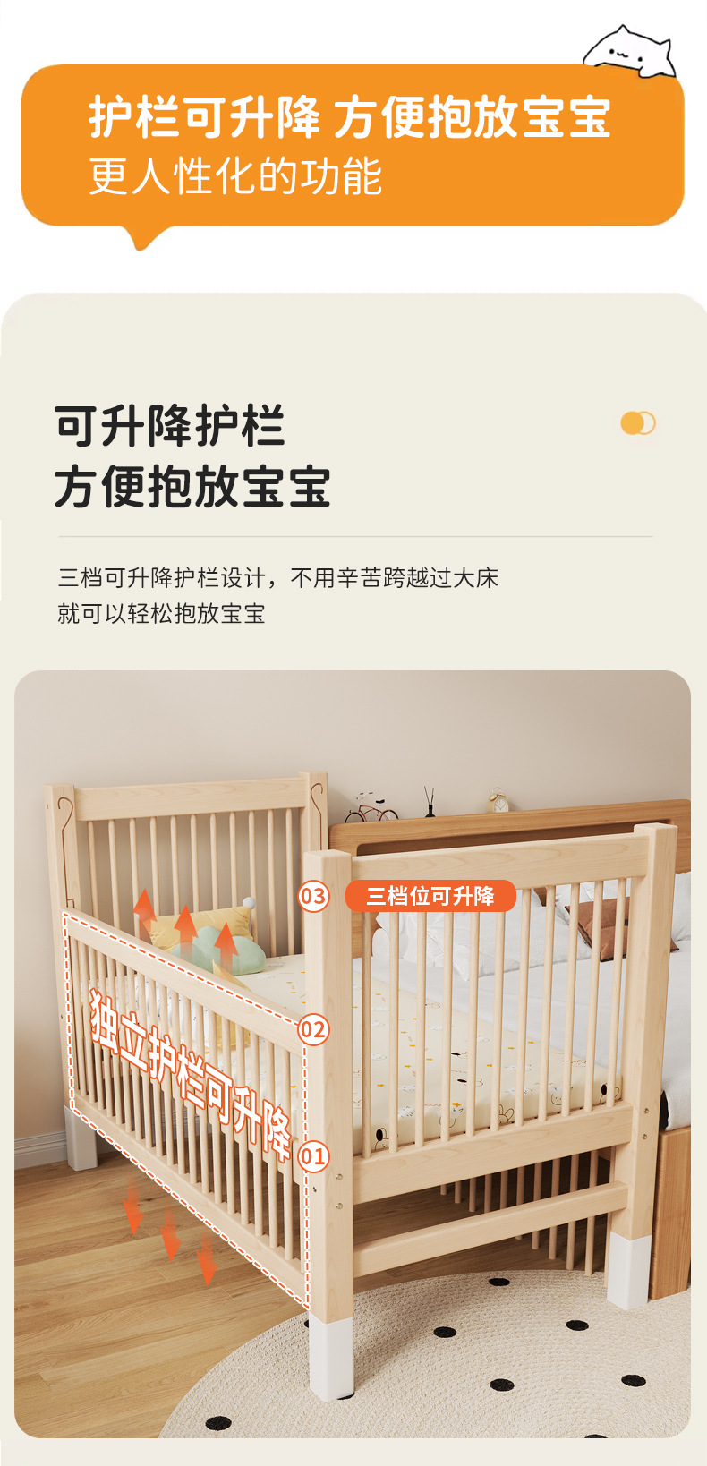 • 3면 + 5cm 코코넛 야자 매트리스, 긴 가드레일 리프트, 침대 높이 15단계 조절, 침대 높이 35-50