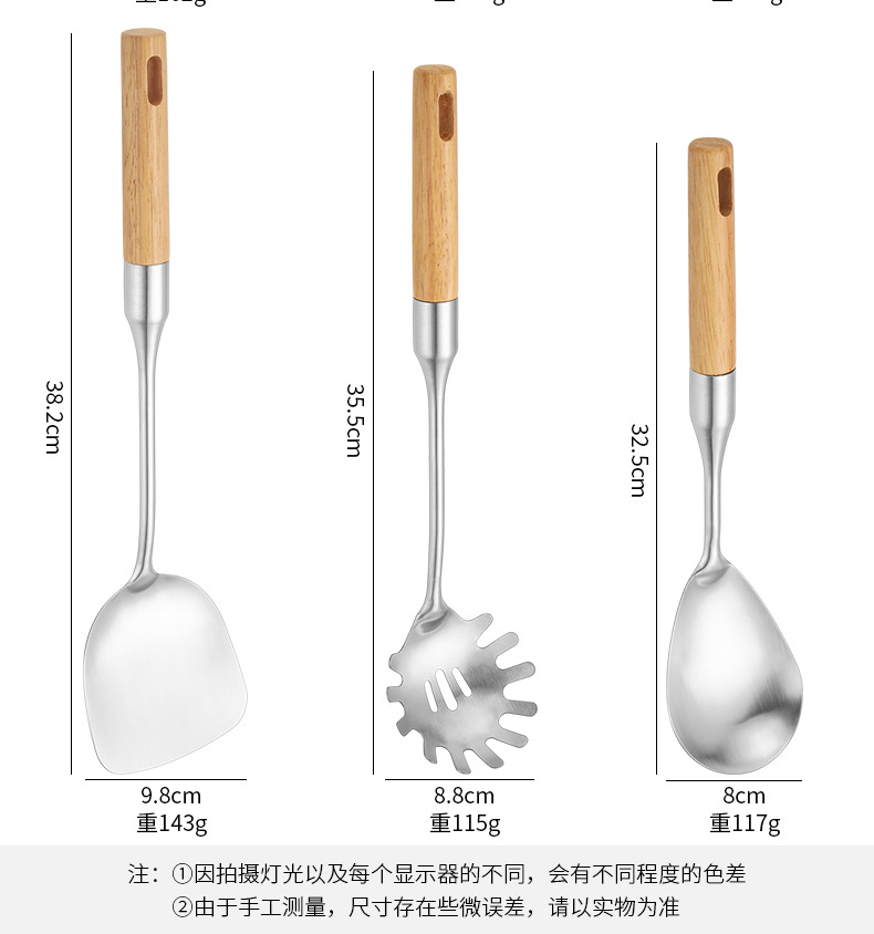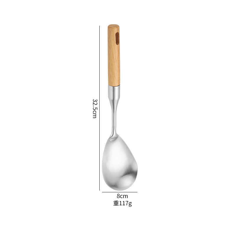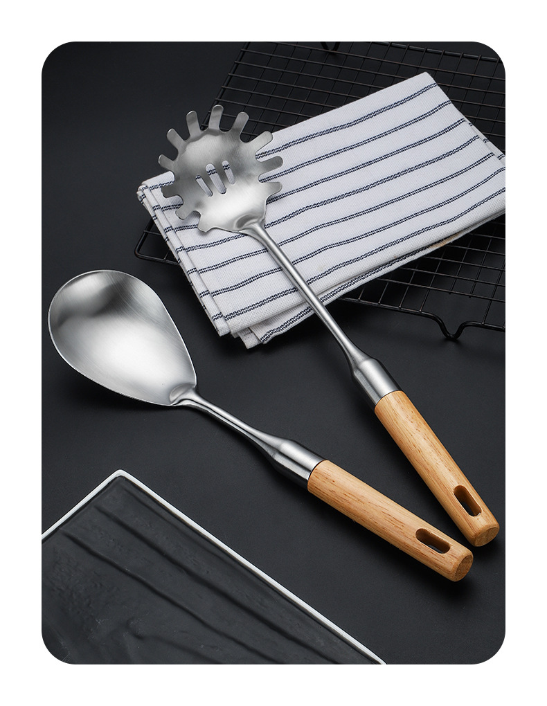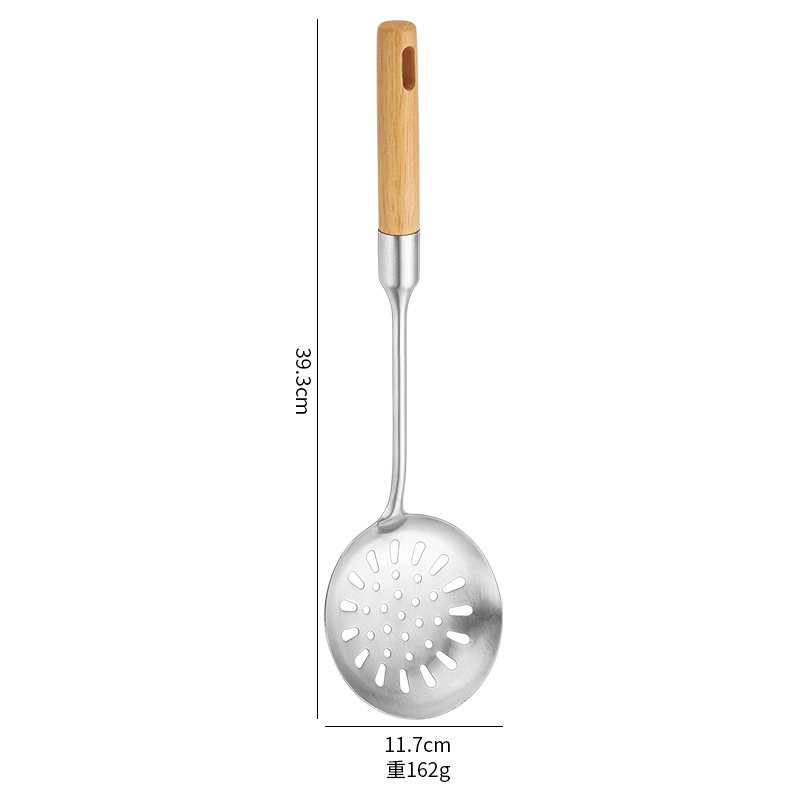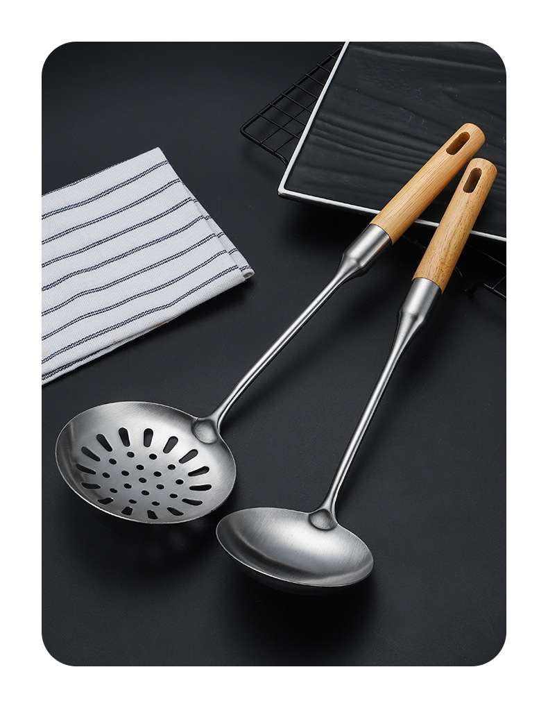 두꺼운 비 자성 스테인레스 스틸 주걱 소쿠리 세트 주방 나무 손잡이 큰 소쿠리 볶음 삽 요리 수프 스푼 도매