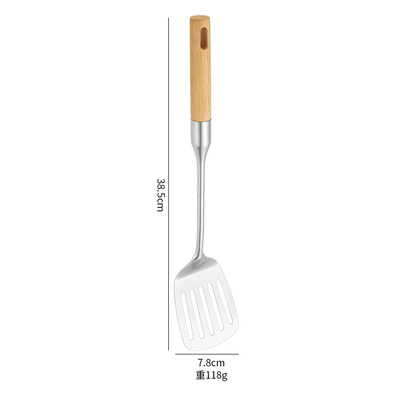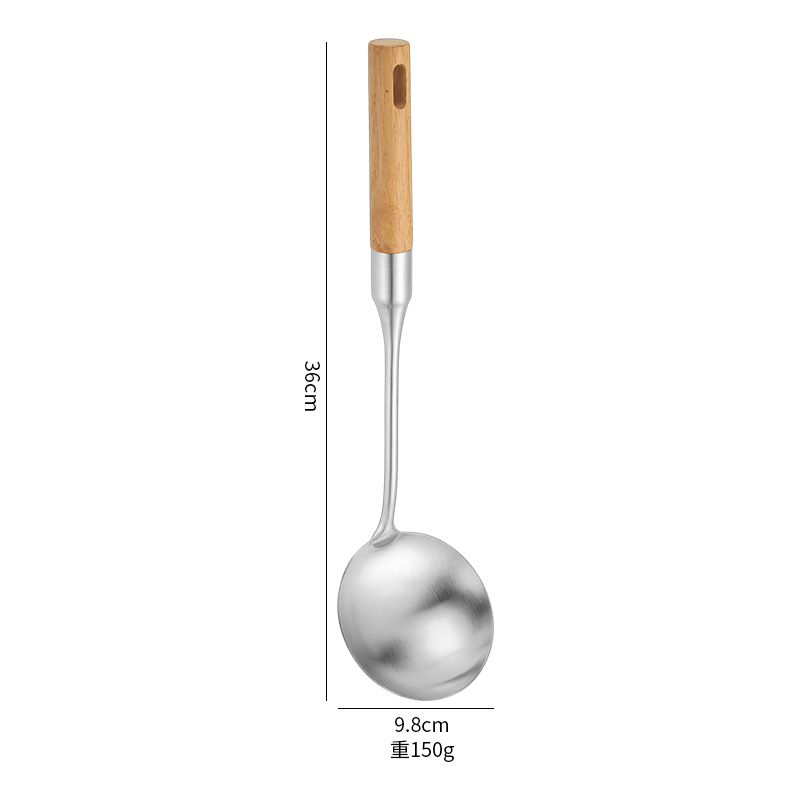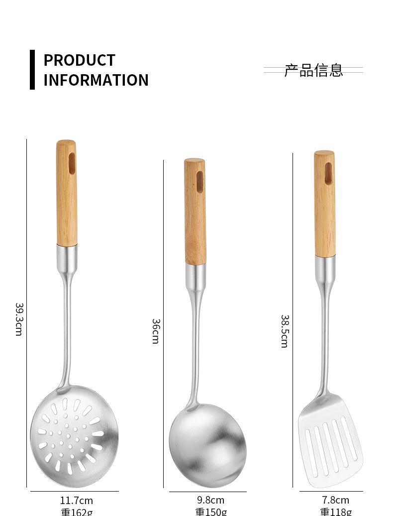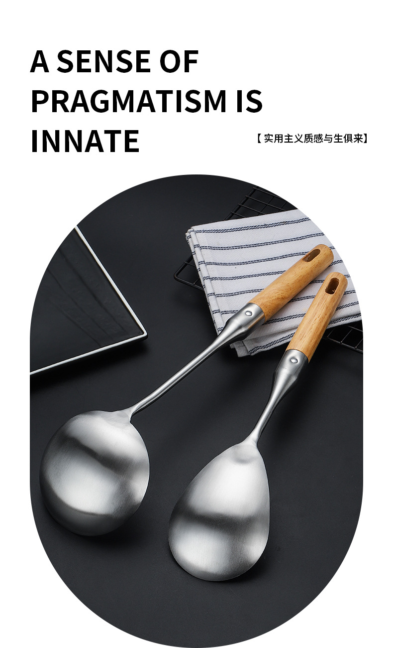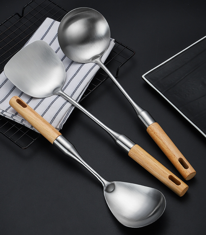 두꺼운 비 자성 스테인레스 스틸 주걱 소쿠리 세트 주방 나무 손잡이 큰 소쿠리 볶음 삽 요리 수프 스푼 도매