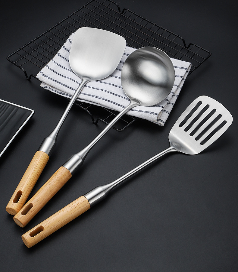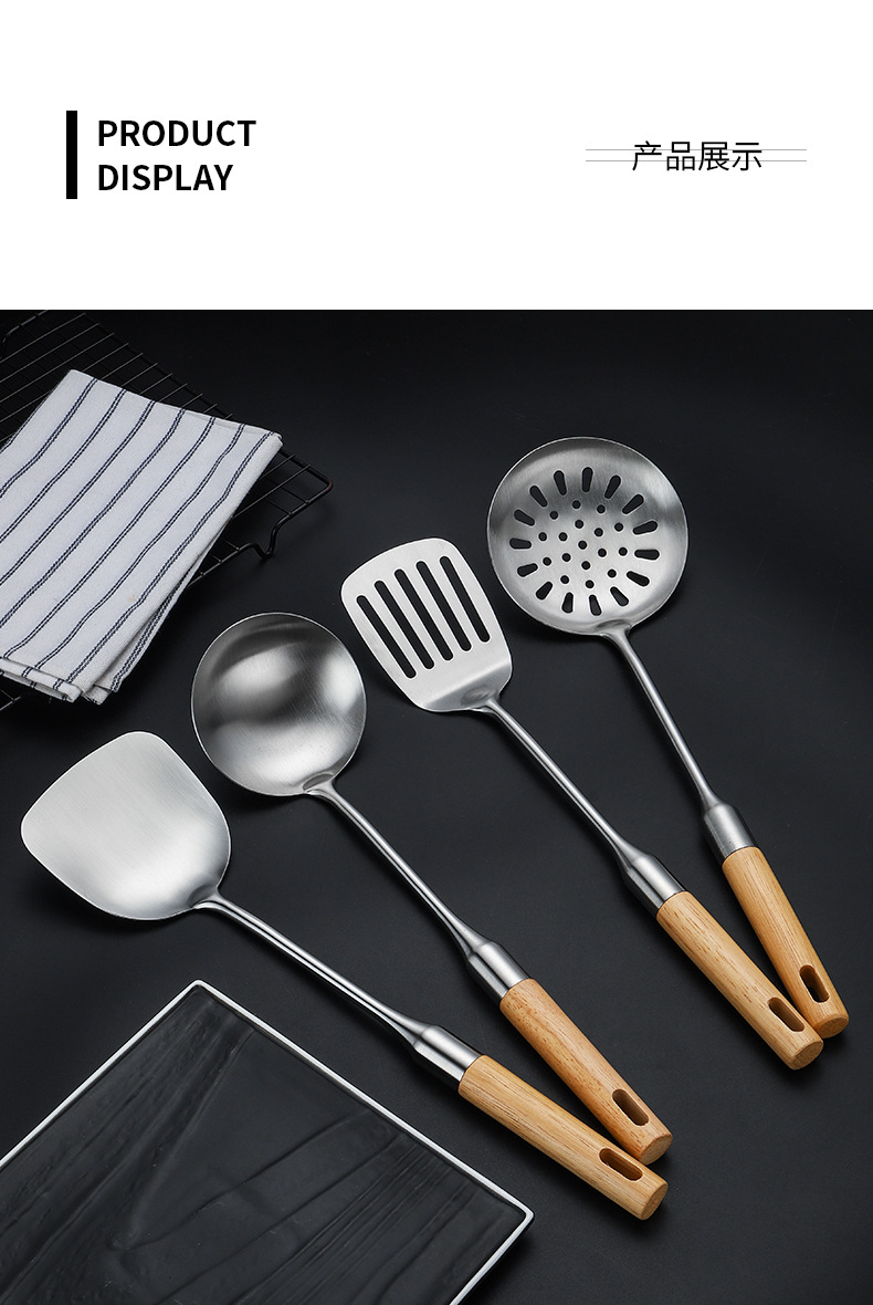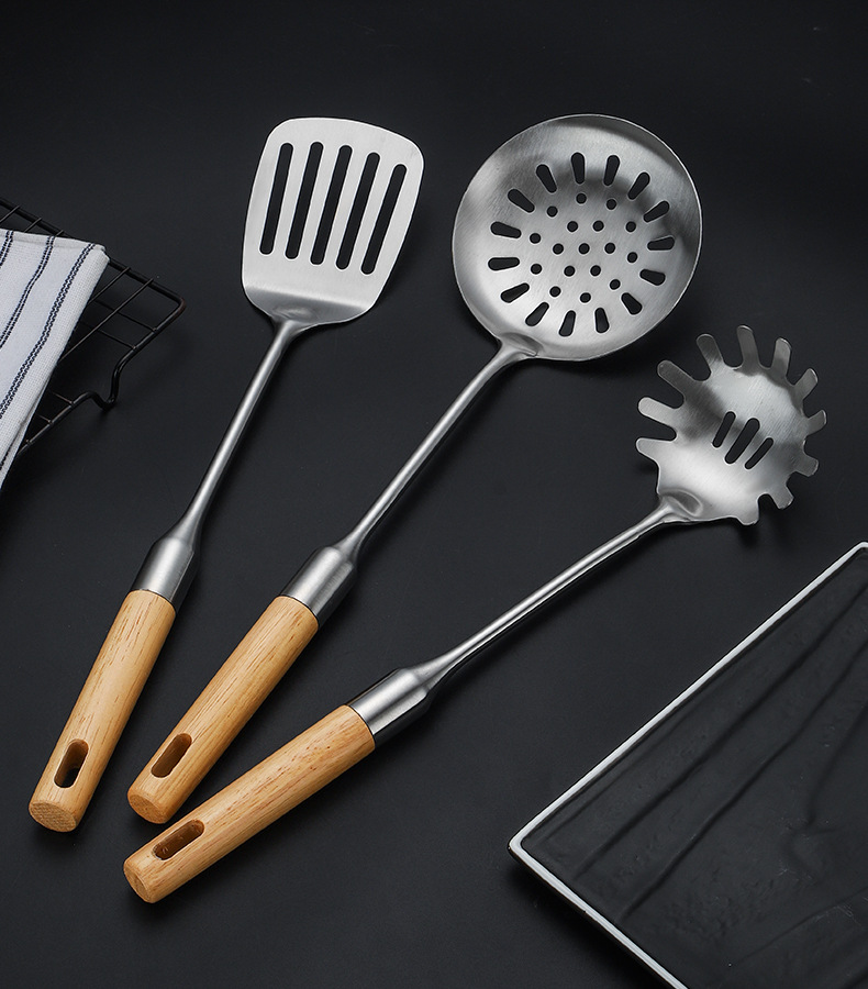 두꺼운 비 자성 스테인레스 스틸 주걱 소쿠리 세트 주방 나무 손잡이 큰 소쿠리 볶음 삽 요리 수프 스푼 도매스토어 가기