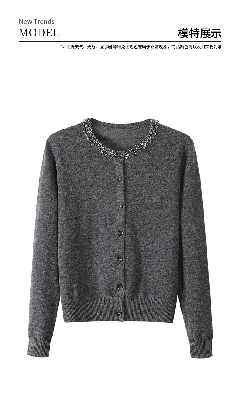 회색 구슬 다크 그레이 양모 니트웨어 여성용 가을과 겨울 새로운 2024 라운드 넥 긴 소매 고급 우아한 탑