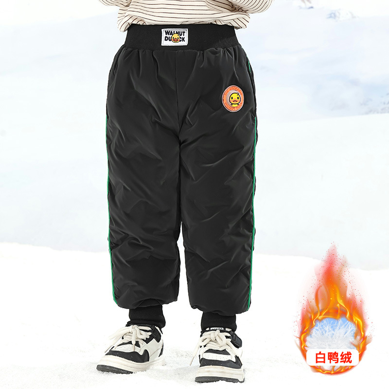 작은 노란 오리 어린이 착용 소년 다운 바지 2024 새로운 겨울 착용 어린 소녀 두꺼운 겨울 작업복 면 바지