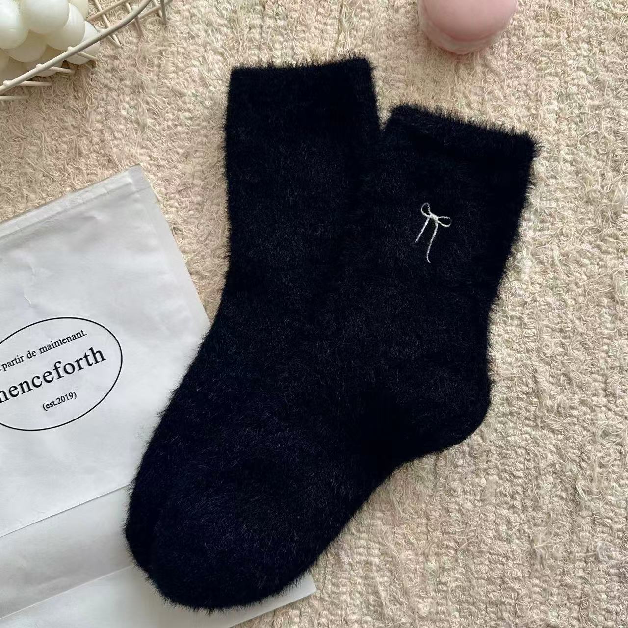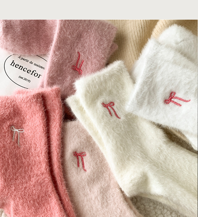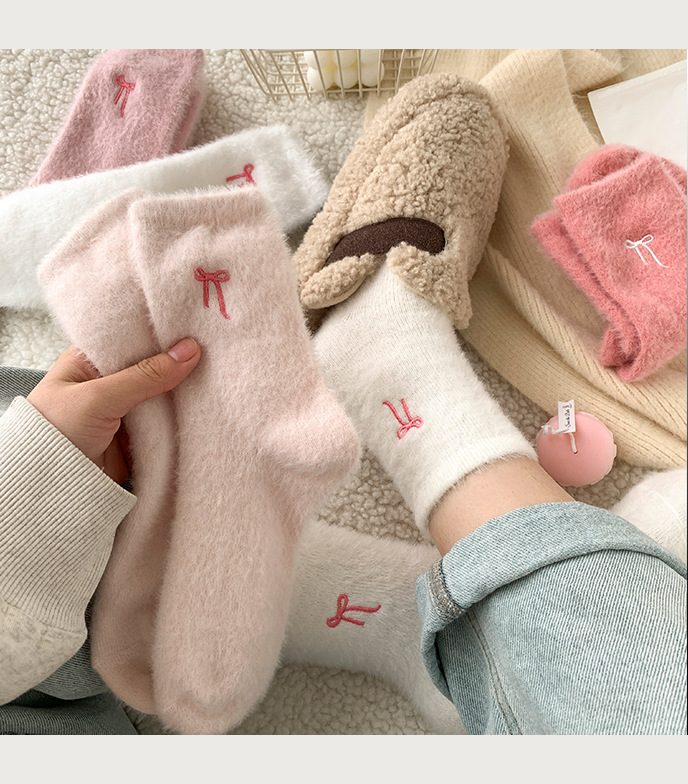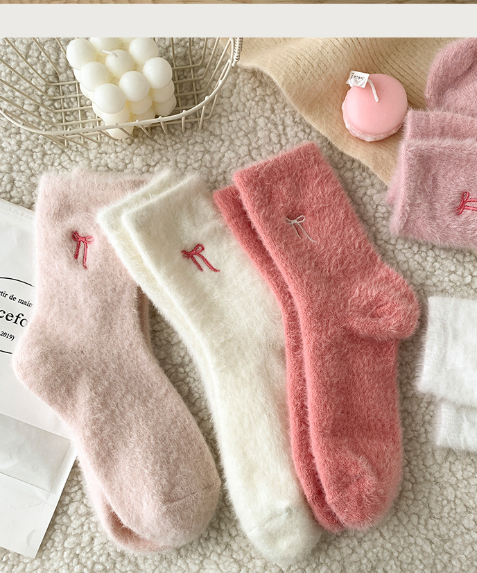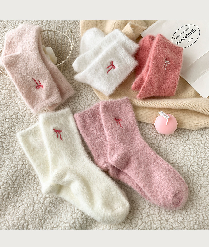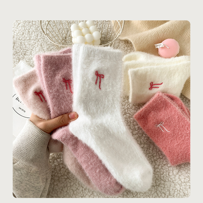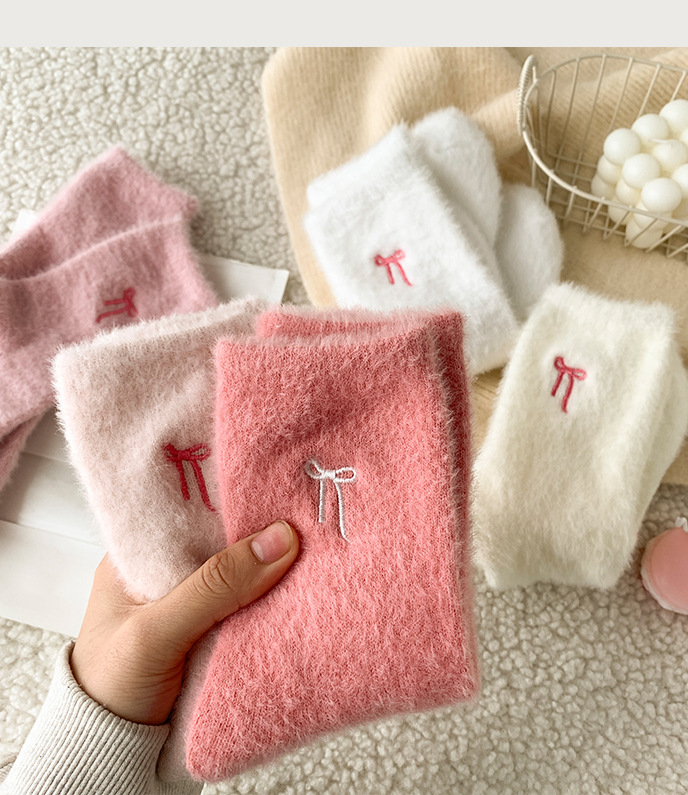 가을 겨울 핑크 나비 자수 여성 양말 플러스 벨벳 두꺼운 따뜻한 양말 홈 플로어 종아리 양말 수면 양말